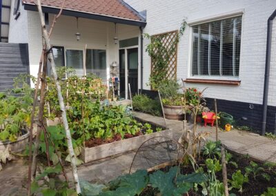 De ruime achtertuin van circa 130 m² is gelegen op het noord/noordoosten en aangelegd met diverse borders, rozenbogen, overdekt terras maar ook pergola met schaduwdoek en meerdere fruitbomen.