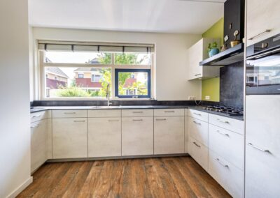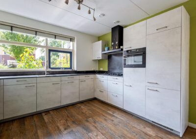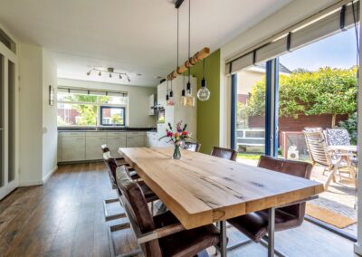 De benedenverdieping is voorzien van vloerverwarming, zodat u het hele jaar door geniet van aangename warmte. Zowel de woonkamer als het eetgedeelte zijn voorzien van openslaande deuren en raampartijen, wat ervoor zorgt dat de tuin een verlengstuk van de keuken en van de kamer is en veel lichtinval geeft in de woning. Aansluitend vindt u de open keuken met inbouwapparatuur.