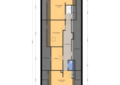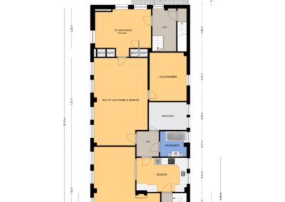 Overloop met toegang tot de keuken, een multifunctionele ruimte, een berging en de badkamer. Er zijn 2 slaapkamers. Een 3e slaapkamer is mogelijk door de multifunctionele ruimte als slaapkamer te gebruiken.