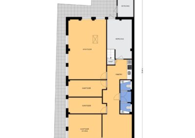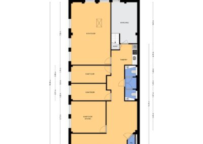 ENTREE met balie en toegang tot de bedrijfsruimte. Er zijn vier kantoorruimtes: twee kleine, één middelgrote en één grote. Daarnaast is er een pantry, een toiletruimte en een berging.