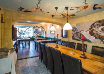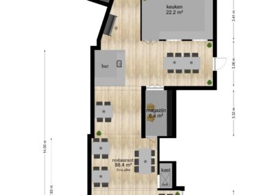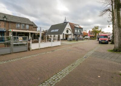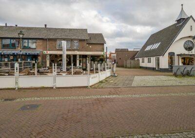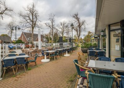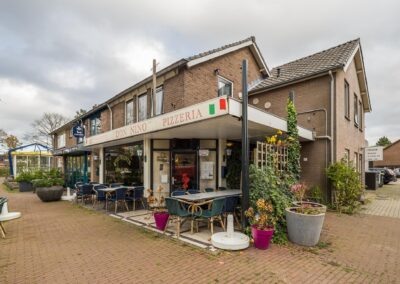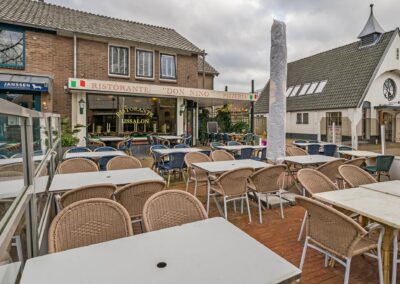 Het restaurant van 82,6 m² heeft circa 36 zitplaatsen, een bargedeelte, professionele keuken, toiletgroep en een magazijn op de begane grond. Aan de voorzijde ligt het terras met circa 60 zitplaatsen direct aan het Kerkplein. De v.v.o. van het restaurant bedraagt 140 m². Het restaurant is al diverse jaren verhuurd aan de Italiaanse pizzeria, er een lang lopend huurcontract aanwezig en de restauranthouder wil hier graag blijven.