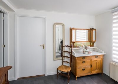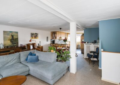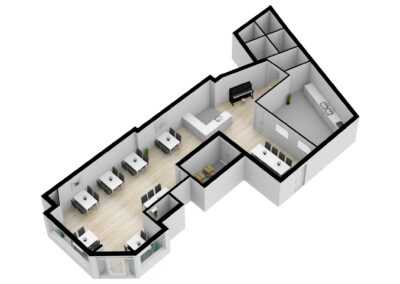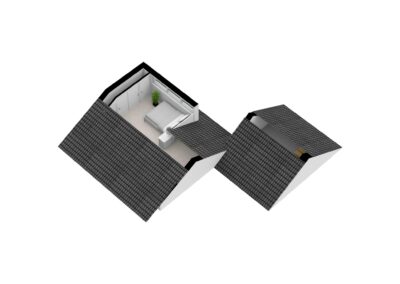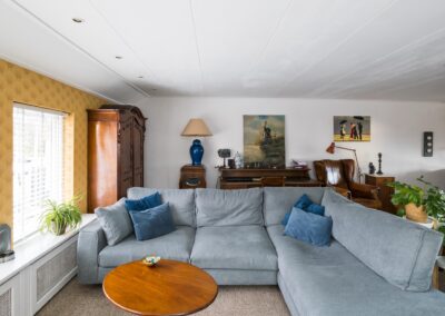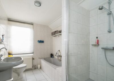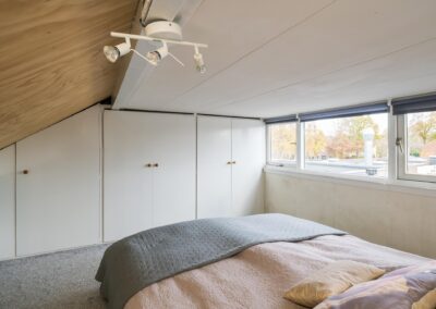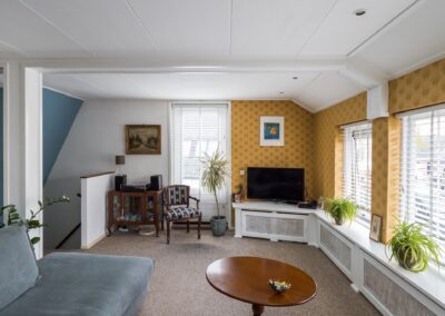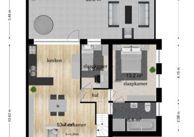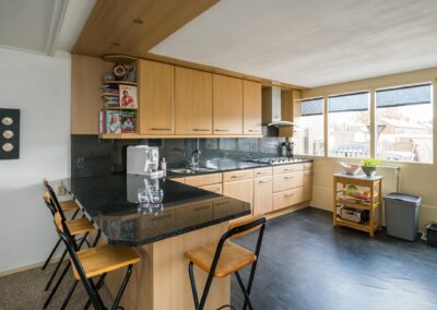 Het appartement van 104 m² op de 1e en 2e verdieping heeft een eigen opgang (hal en bijkeuken op de begane grond) en is ingedeeld met een woonkamer en open keuken van samen 82,5 m², een groot dakterras van 56 m², een balkon en 3 slaapkamers en een badkamer.