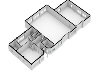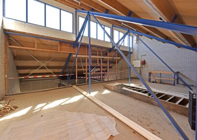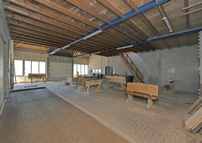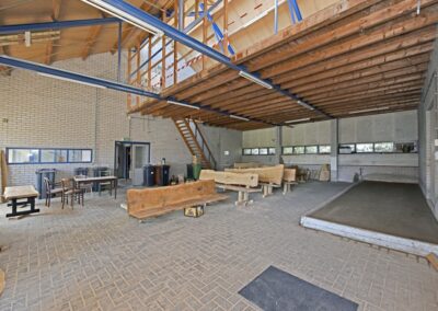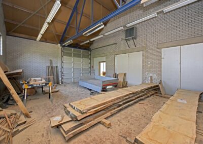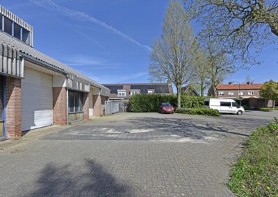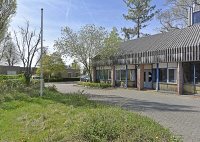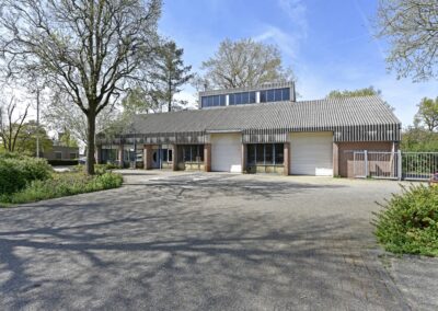 Begane grond: hal met meterkast, toiletruimte en bergkast, kantoor van 43,89 m², kamer van 8,59 m² en 2e hal naar kleedruimte. Er zijn 2 grote loodsen van resp 150,35 m² en 74,32 m². Van buitenaf is er een berging van 8,41 m² bereikbaar.