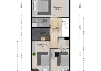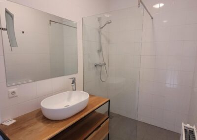 2e Verdieping: overloop, 3 goede slaapkamers, moderne badkamer voorzien van een inloopdouche en wastafelmeubel en een bergruimte met de CV-ketel en de aansluitingen voor de wasmachine en droger.