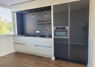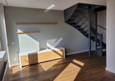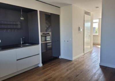 1e Verdieping: hal, moderne toiletruimte, lichte woonkamer met toegang tot het balkon op het zuidoosten, open en moderne keuken aan de voorzijde van het appartement en voorzien van een gaskookplaat, combi-oven, vaatwasser en koel-/ vriescombinatie. Deze gehele verdieping is afgewerkt met een mooie lamel parketvloer. Vanuit de woonkamer een open trap naar de verdieping.