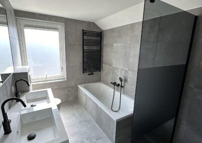• Luxe badkamer: Een tevens nieuwe, elegant afgewerkte badkamer in betonlook stijl met matzwarte details, voorzien van ligbad, inloopdouche, dubbele wastafel, toilet en designradiator.
