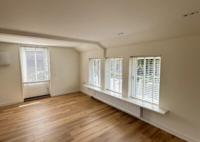 • Ruime woonruimte: Deze maisonnette is onlangs gerenoveerd, alle wanden/plafonds zijn gestuct en gesaust. De royale woonkamer beschikt over veel natuurlijk licht door de grote raampartijen met luxe houten shutters.