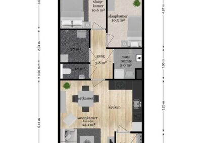 Overdekte entree naar de hal met toegang tot toilet met fonteintje en de woonkamer met veel lichtinval. De lichte keuken is voorzien van diverse inbouwapparatuur. Via de gang toegang tot 2 slaapkamers, volledig betegelde badkamer uitgerust met een douche en wastafel en de inpandige berging voorzien van CV-ketel en aansluiting voor de wasmachine en droger.