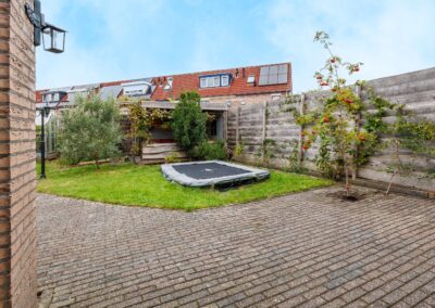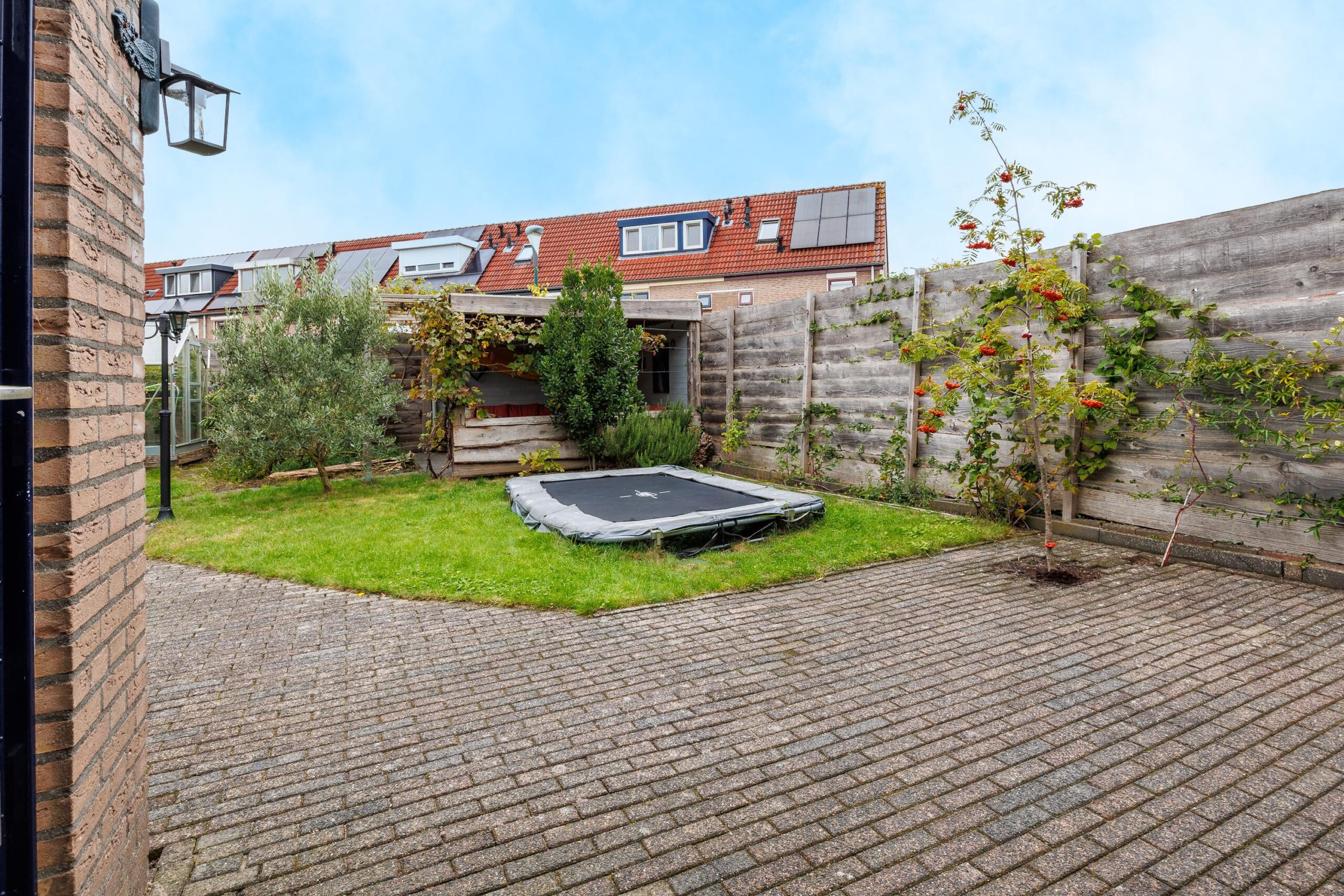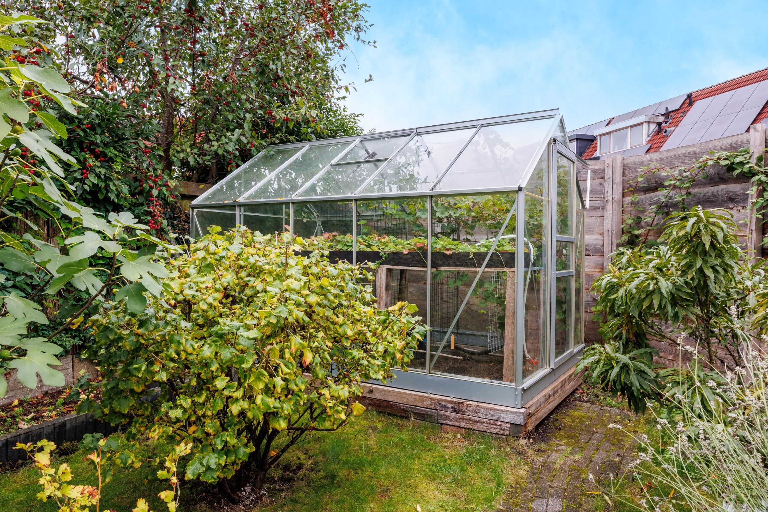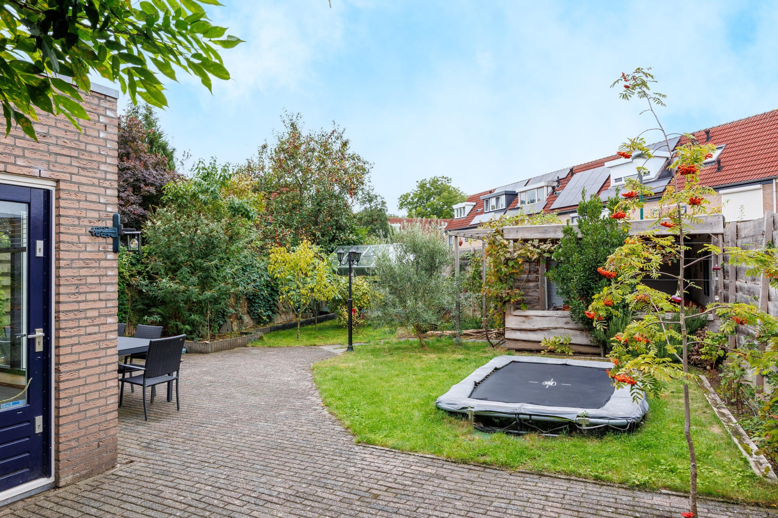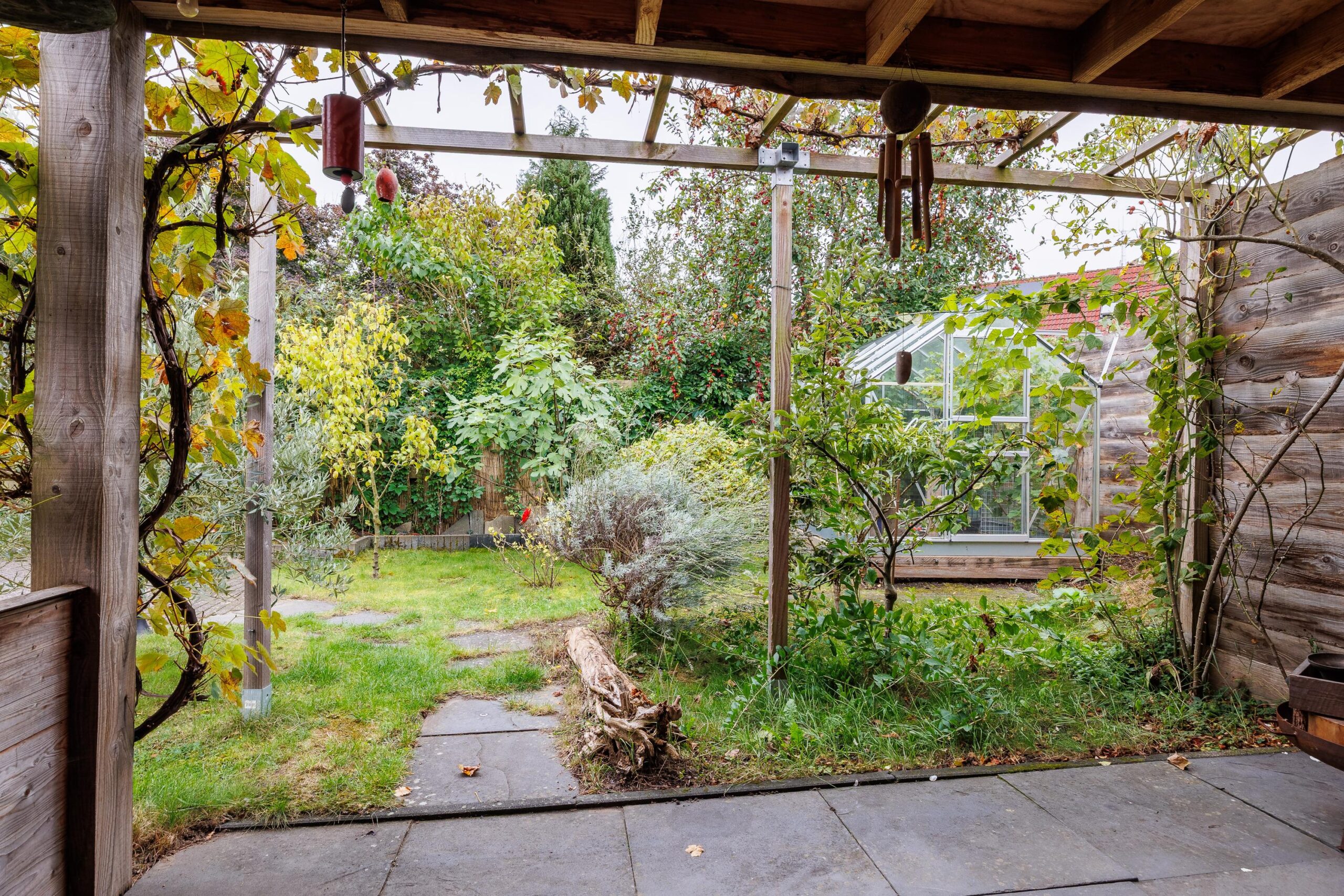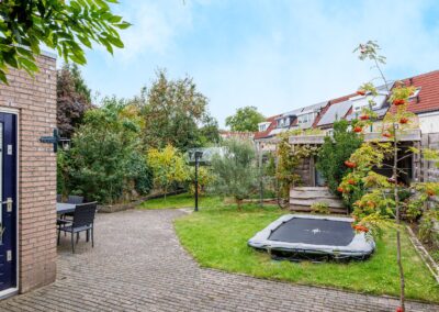 De fraai aangelegde tuin van meer dan 13 meter diep is gelegen op het zonnige westen groot terras, overdekt terras, tuinkas, trampoline en diverse soorten groen.