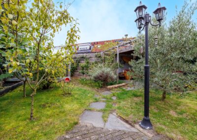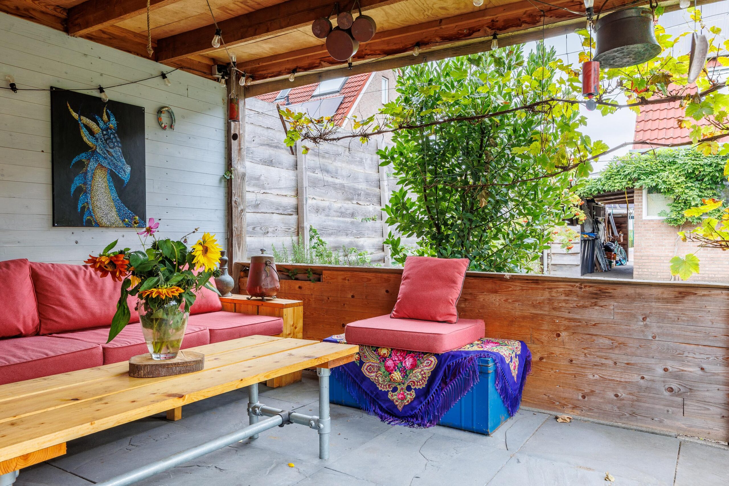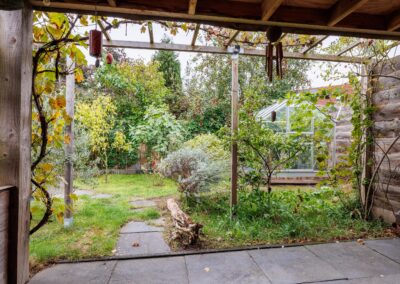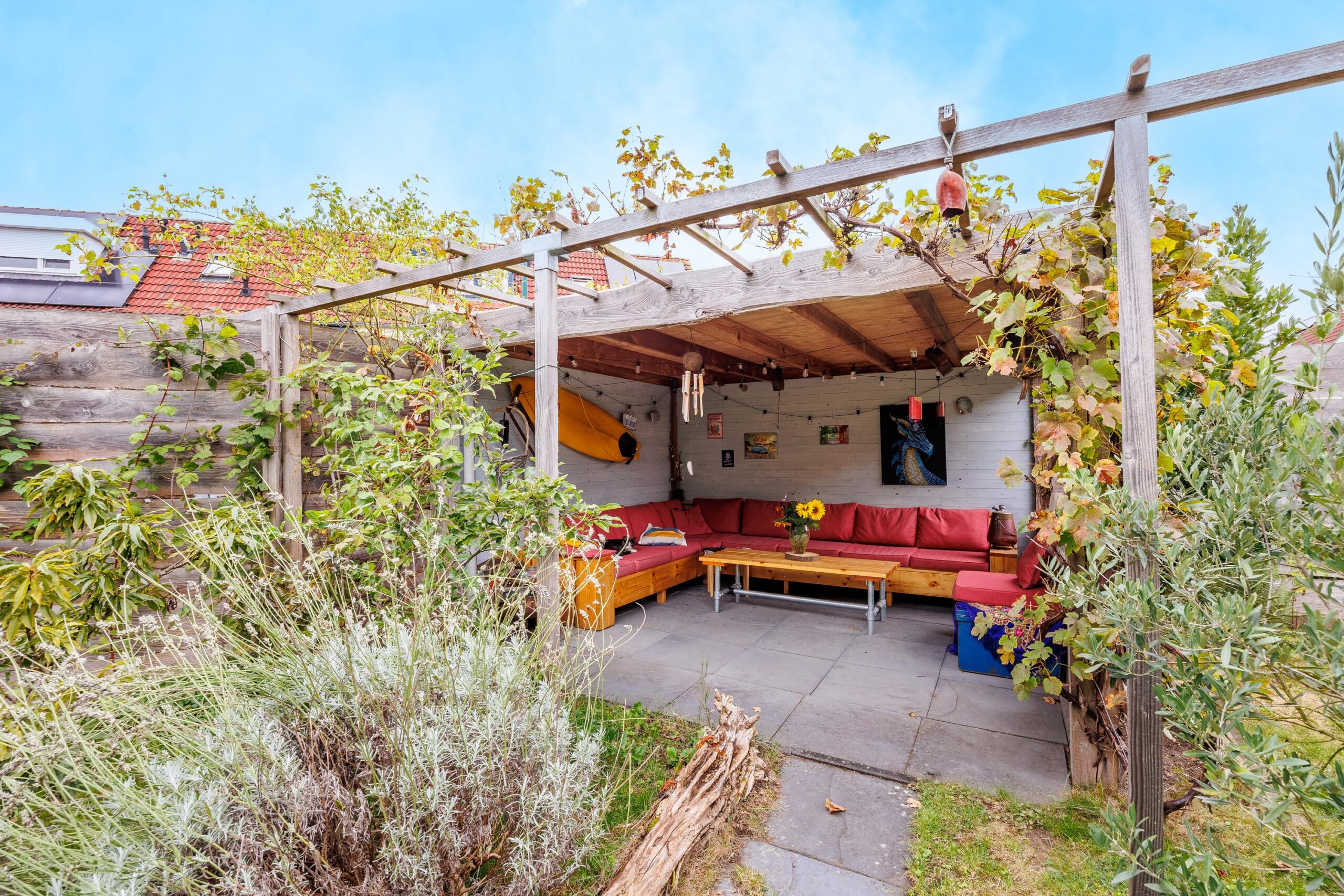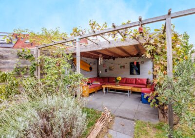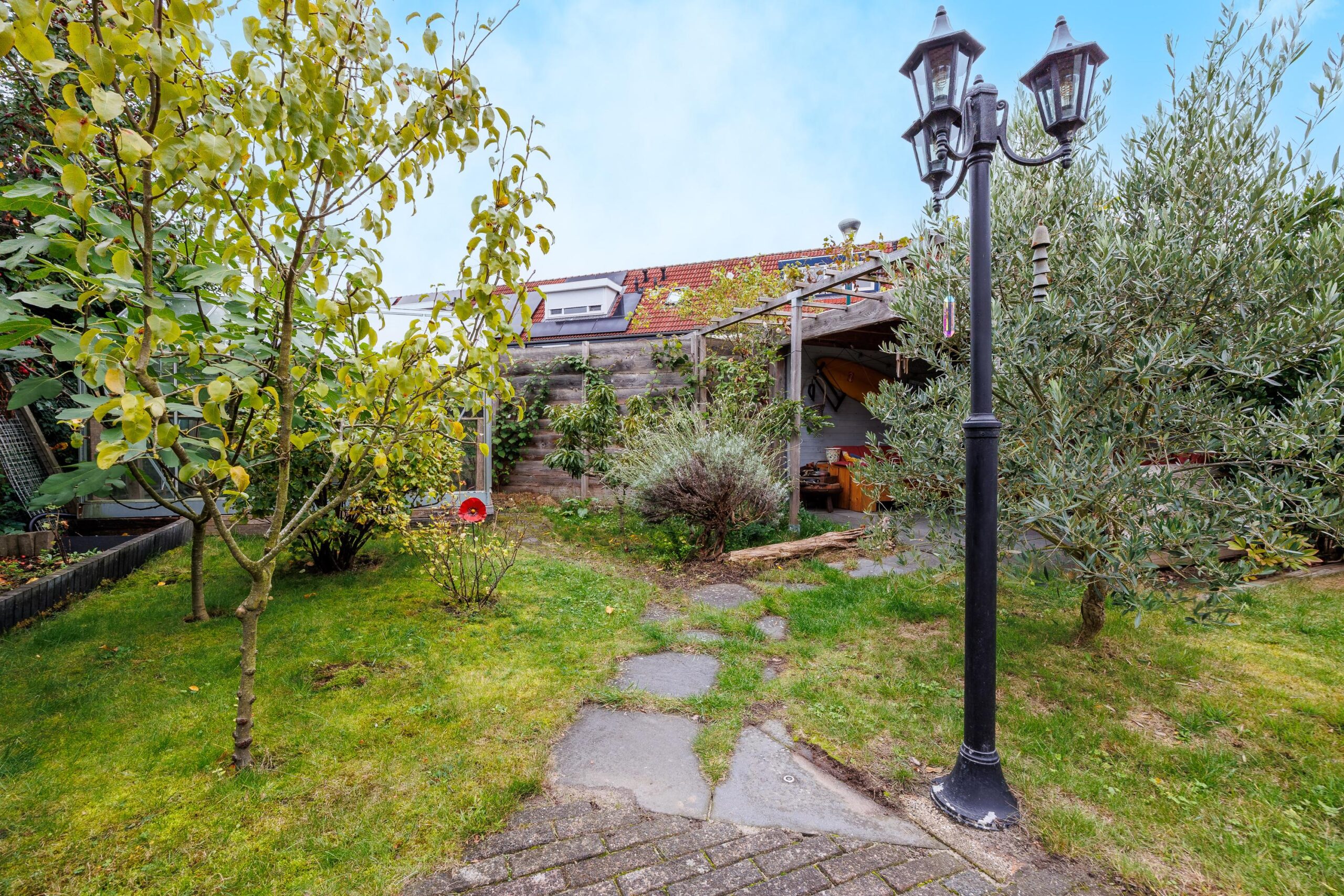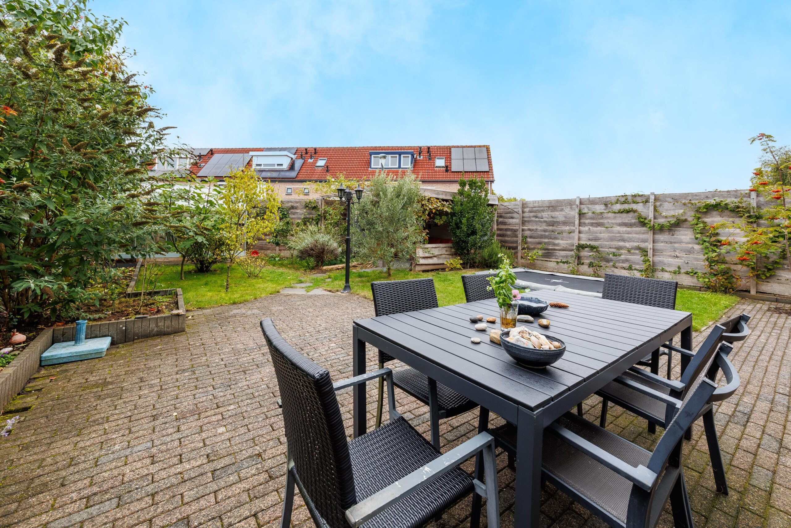 De fraai aangelegde tuin van meer dan 13 meter diep is gelegen op het zonnige westen groot terras, overdekt terras, tuinkas, trampoline en diverse soorten groen.