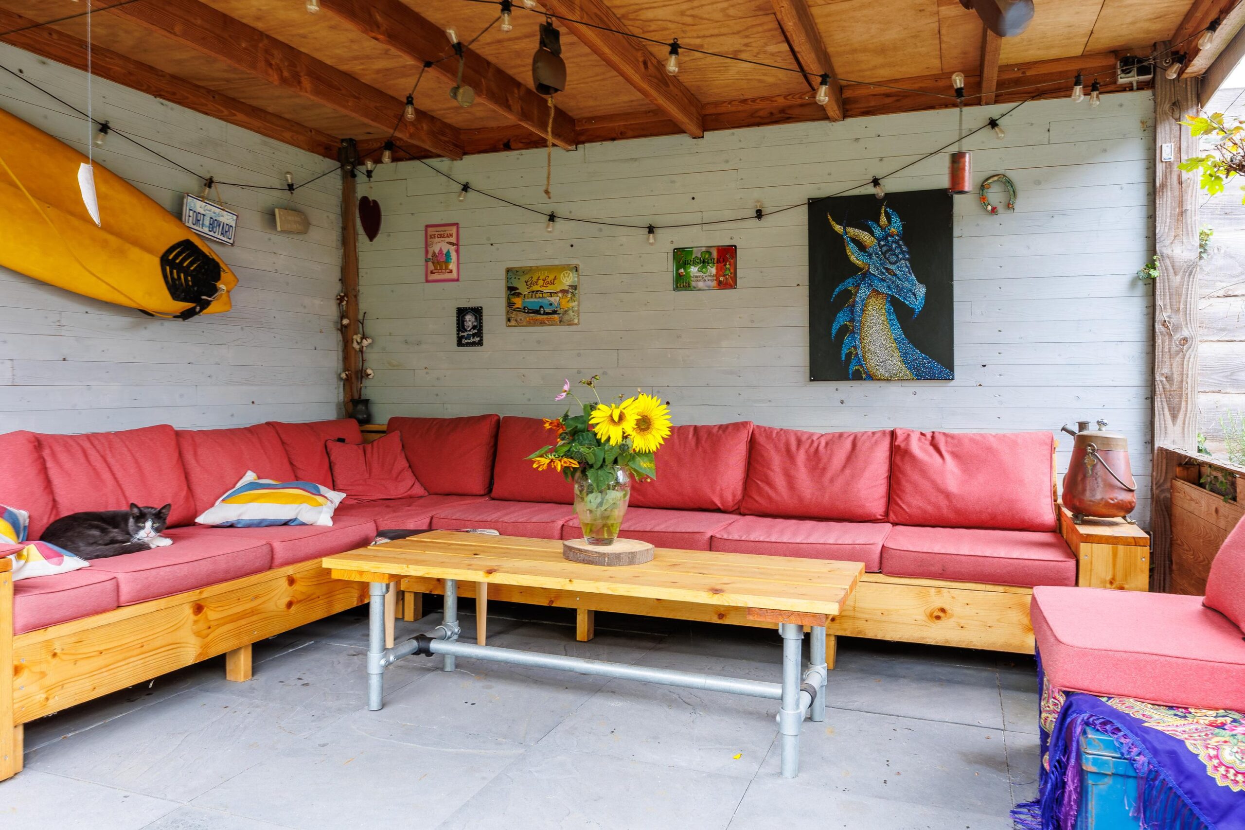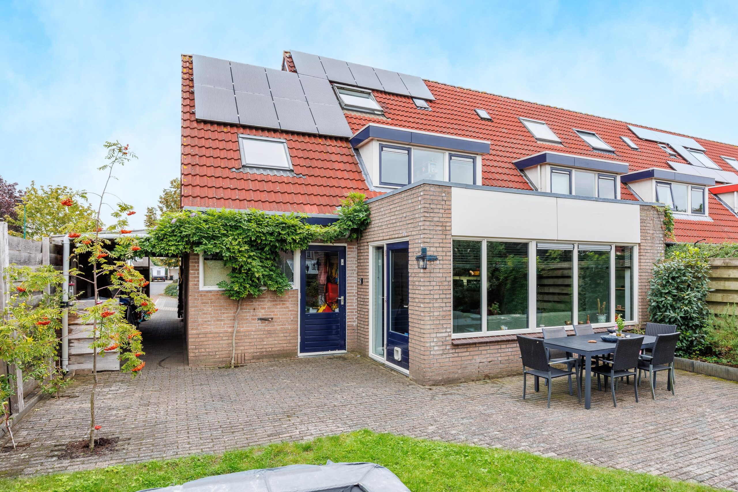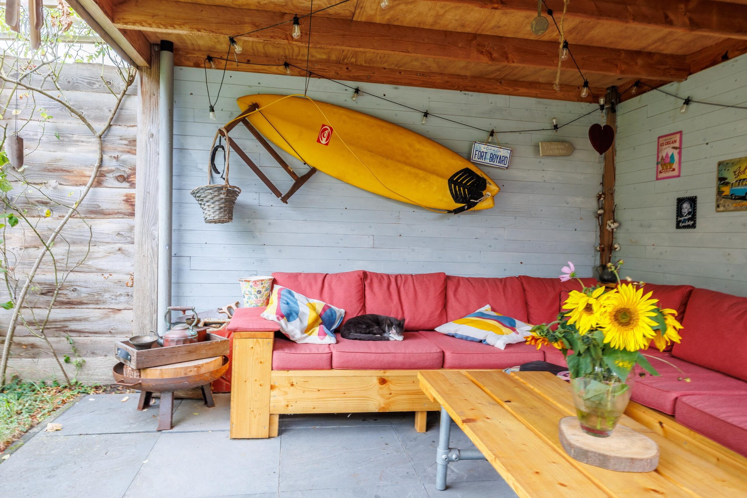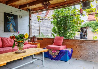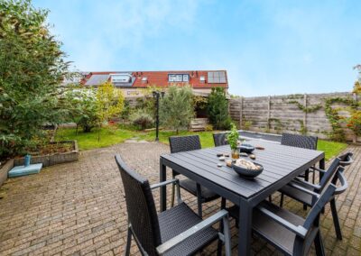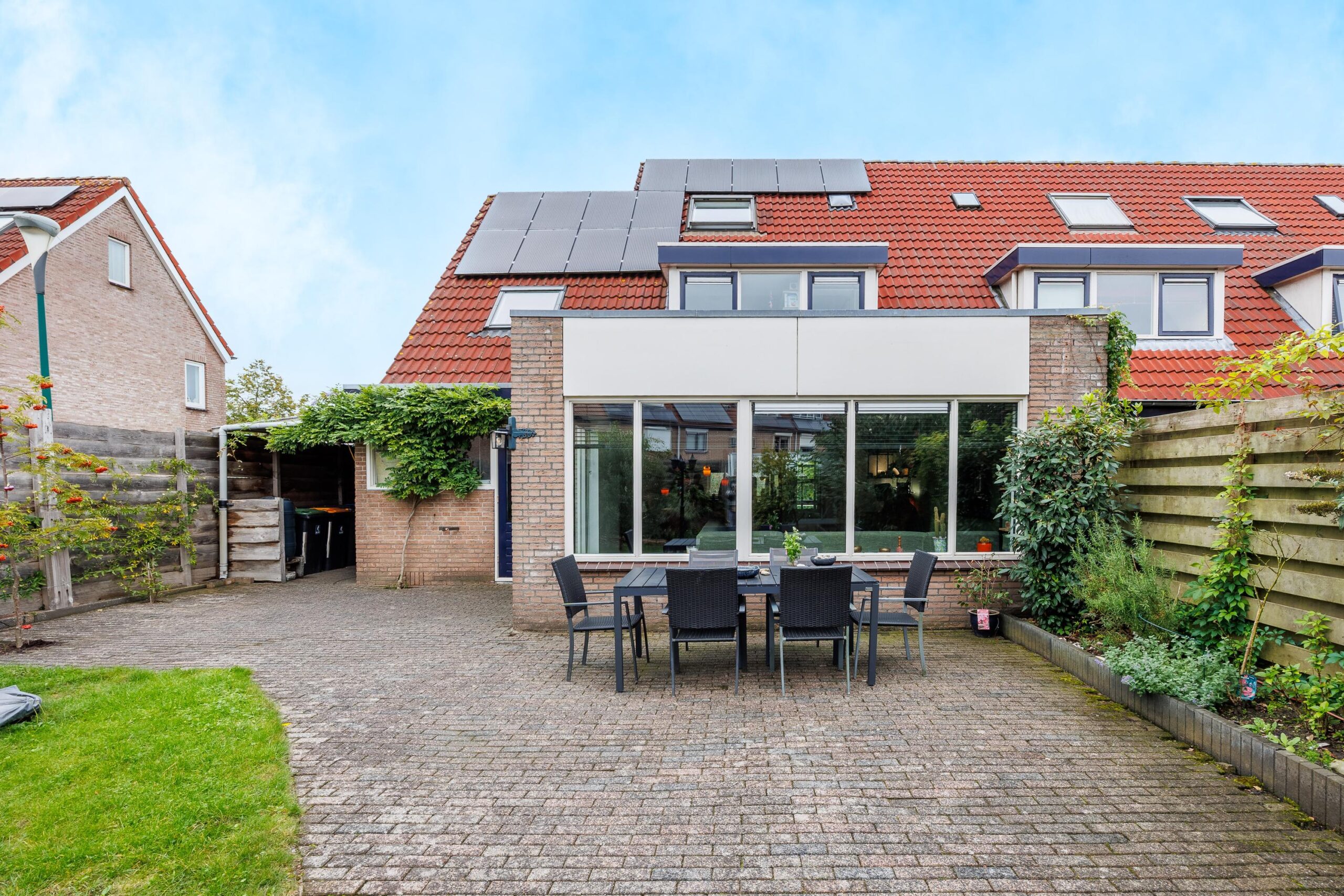 De fraai aangelegde tuin van meer dan 13 meter diep is gelegen op het zonnige westen groot terras, overdekt terras, tuinkas, trampoline en diverse soorten groen.