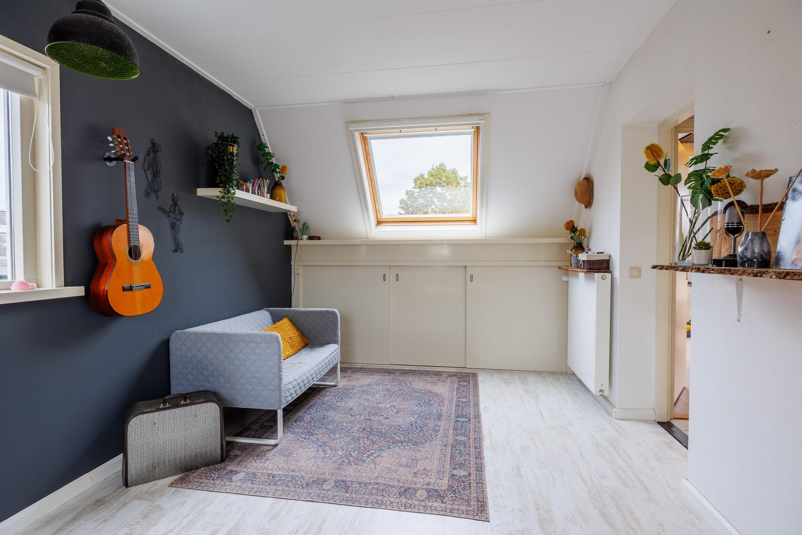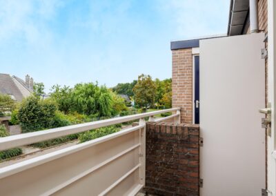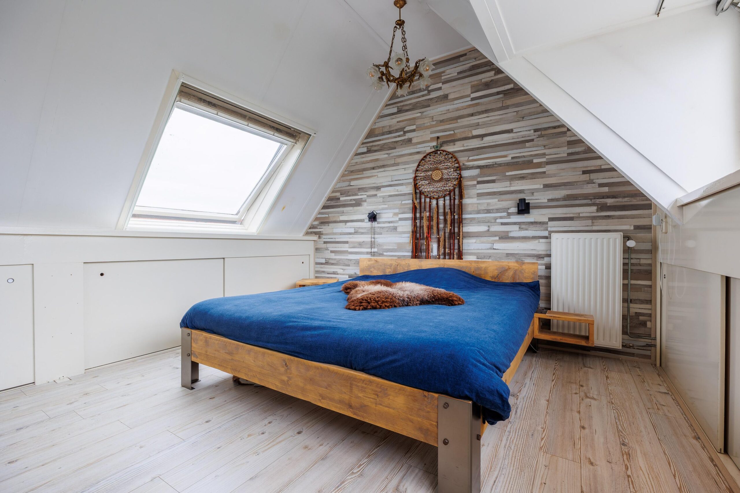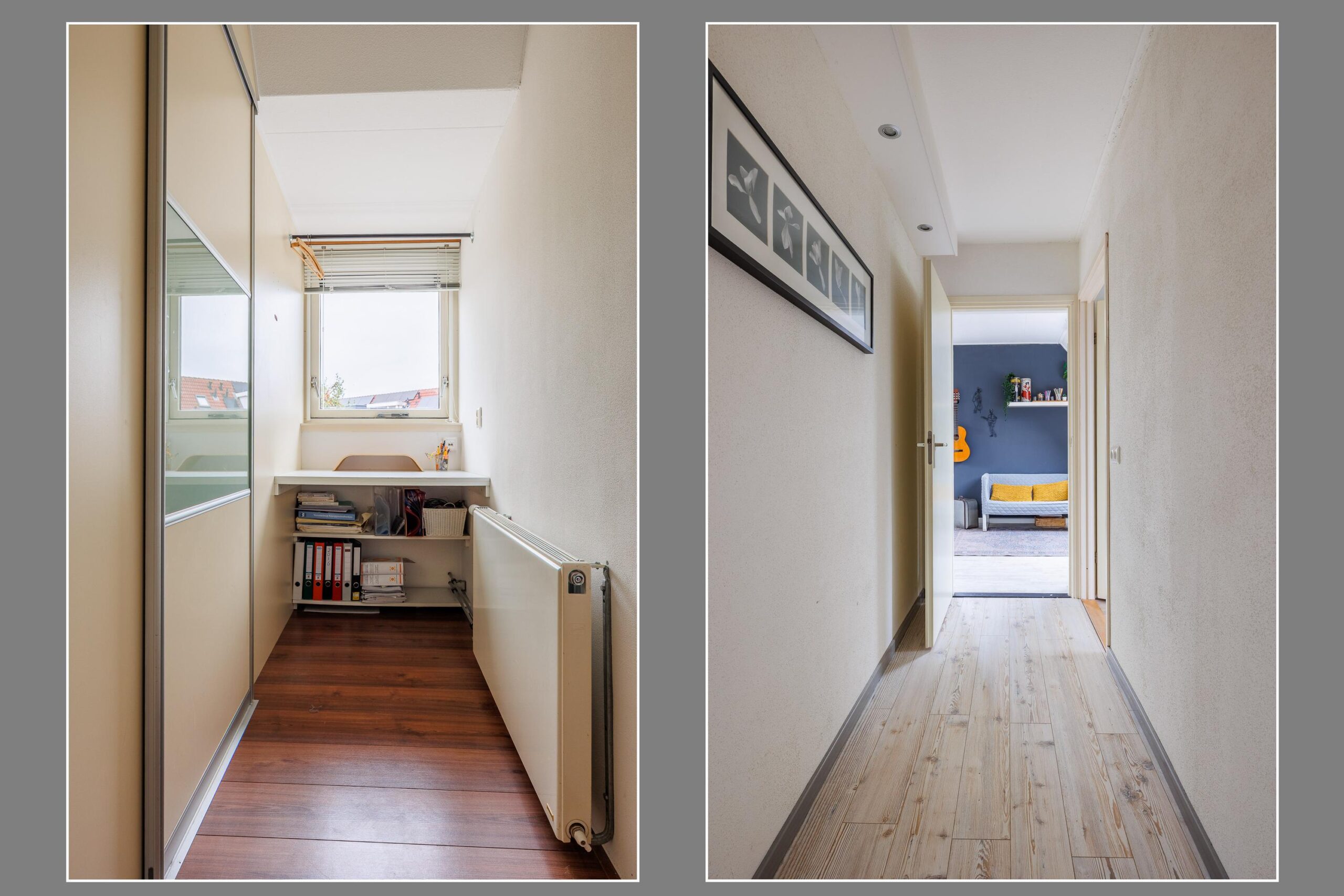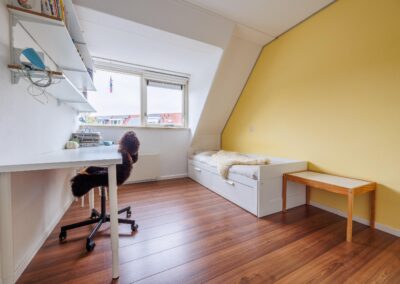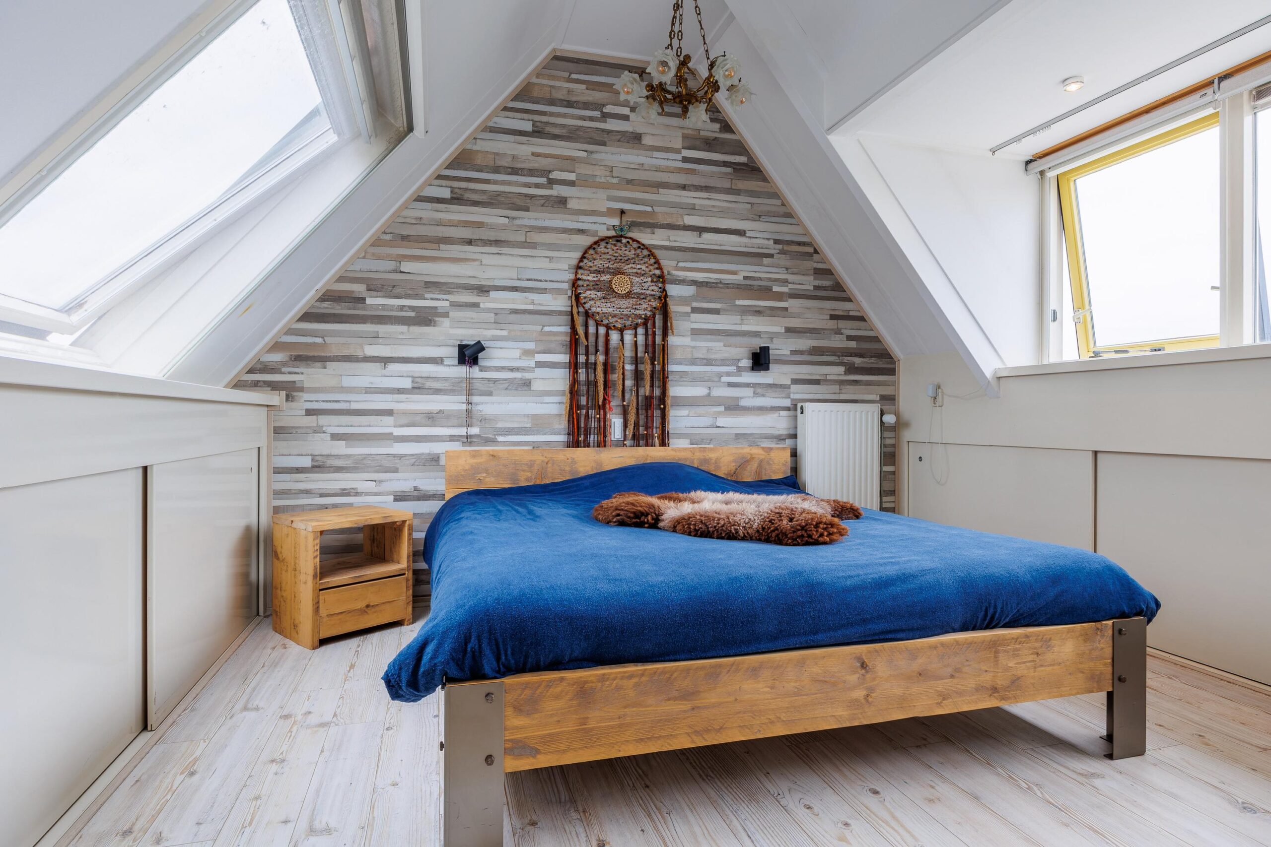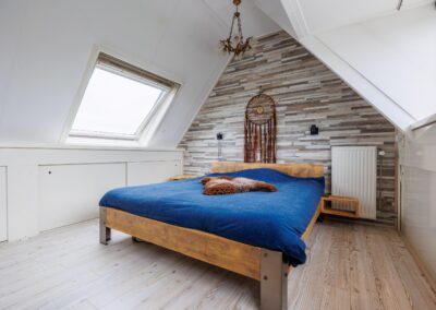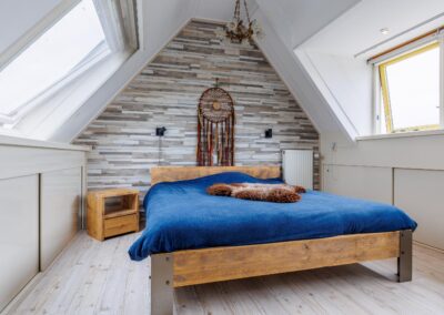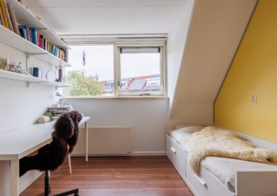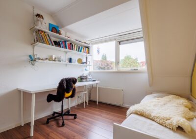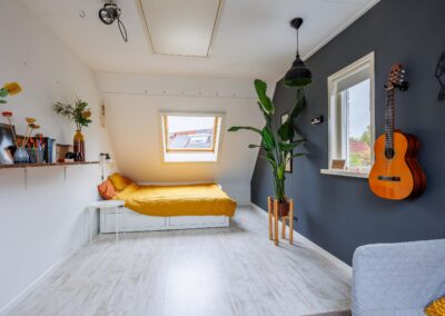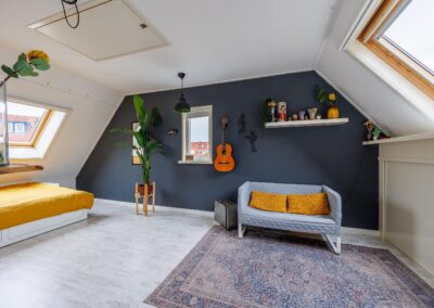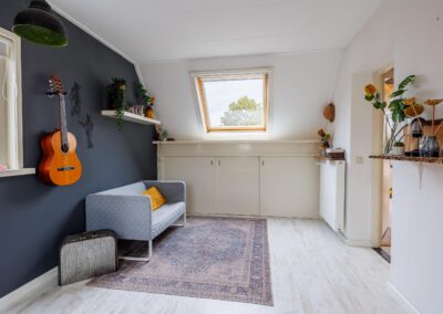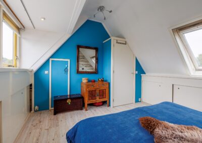 Met de vaste trap bereikt je de overloop. Aanslutiend toegang tot zolderkamer van 12,5 m² met dakkapel en bergruimte onder de knieschotten (schuifkasten). Voorts aanwezig op deze verdieping zijn de opstelling cv-ketel, omvormer zonnepanelen en mechanische ventilatie box.