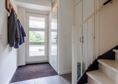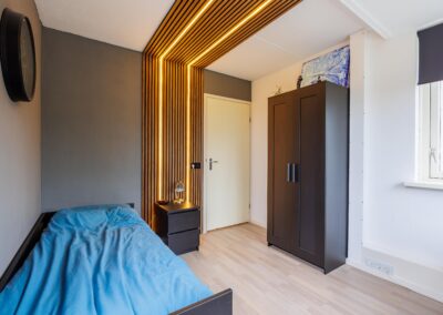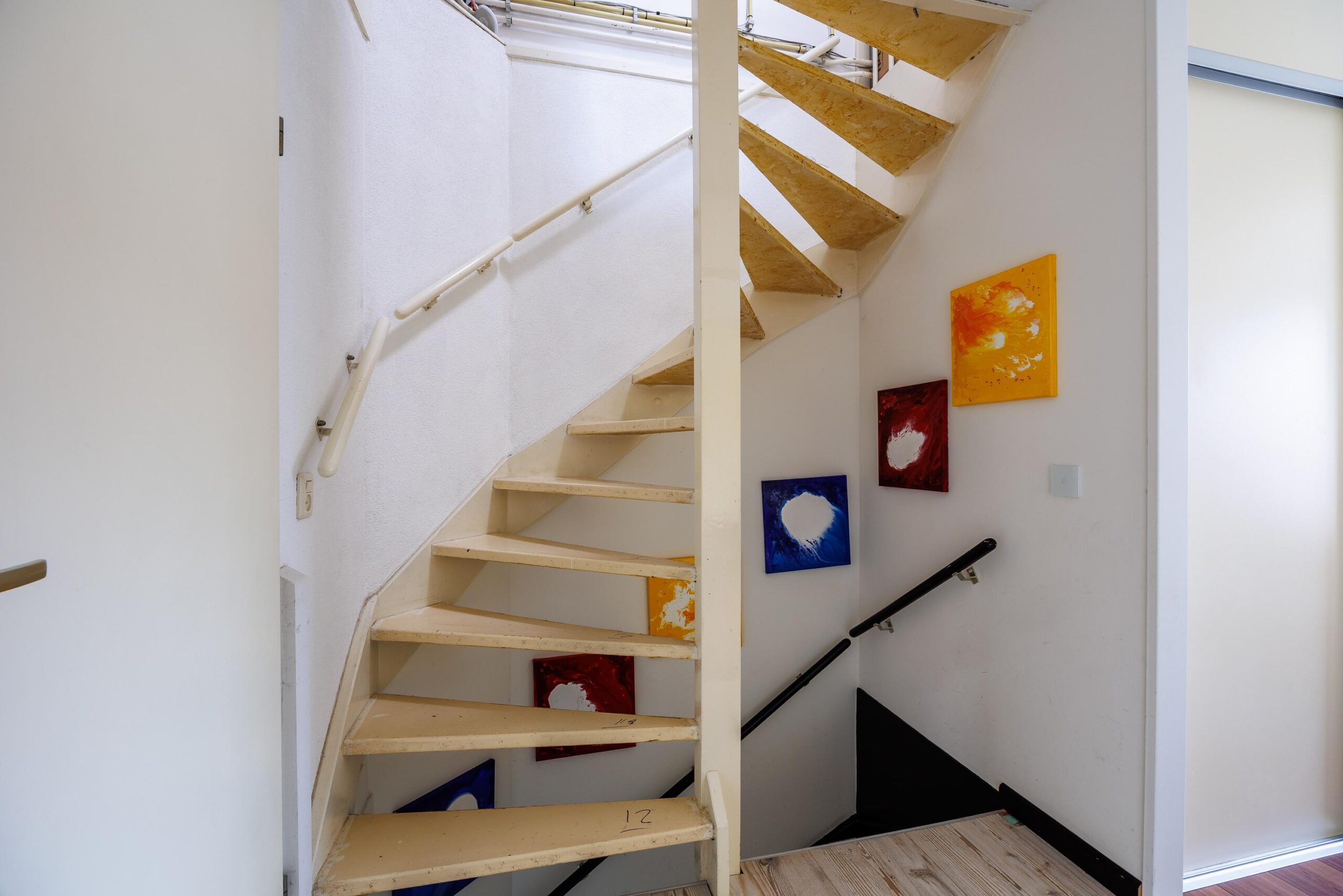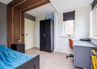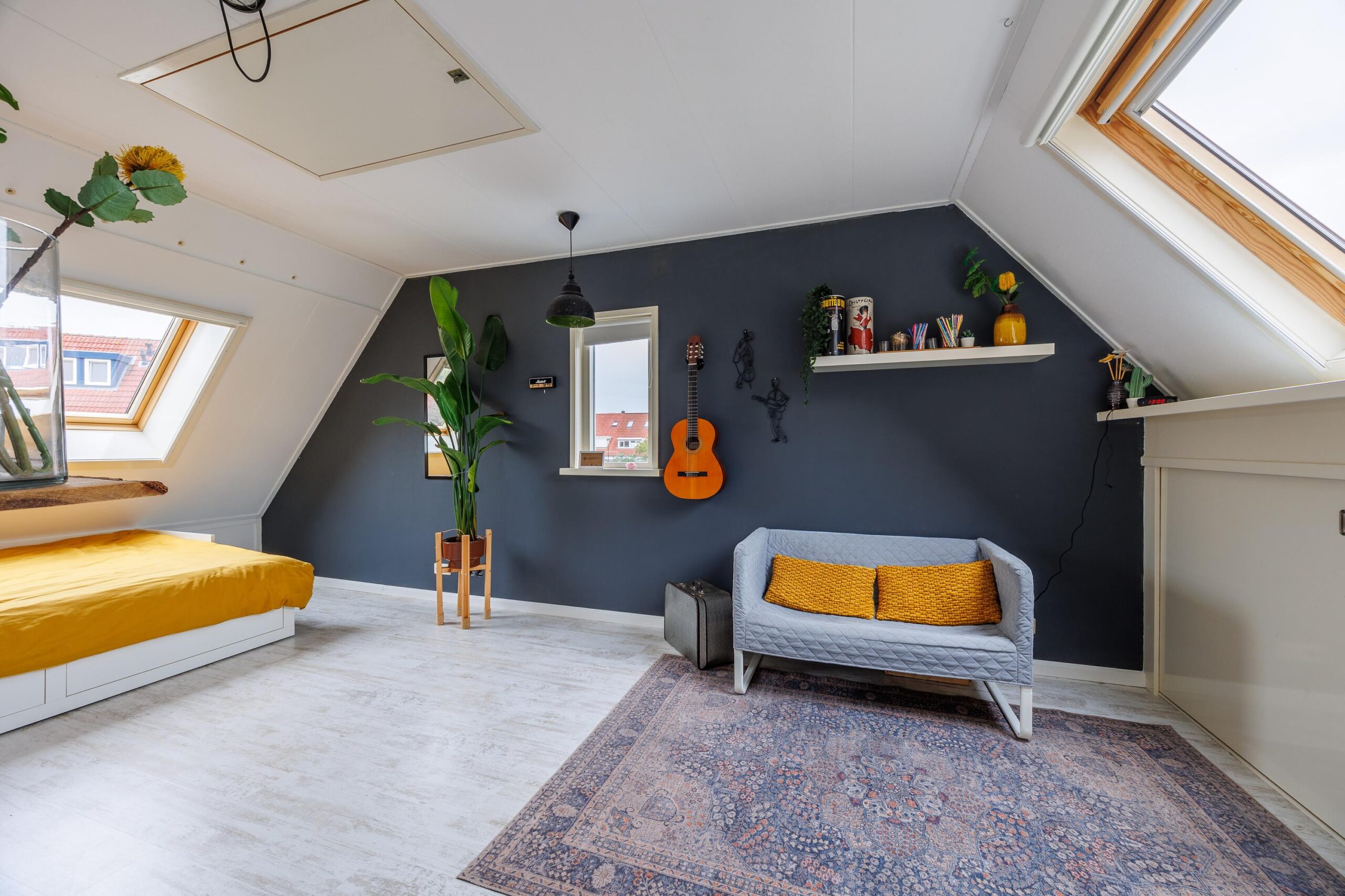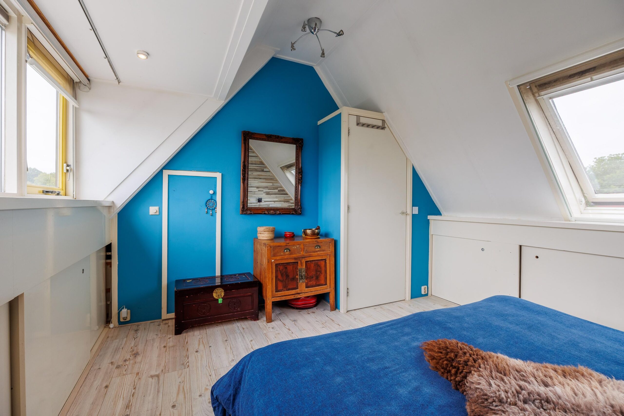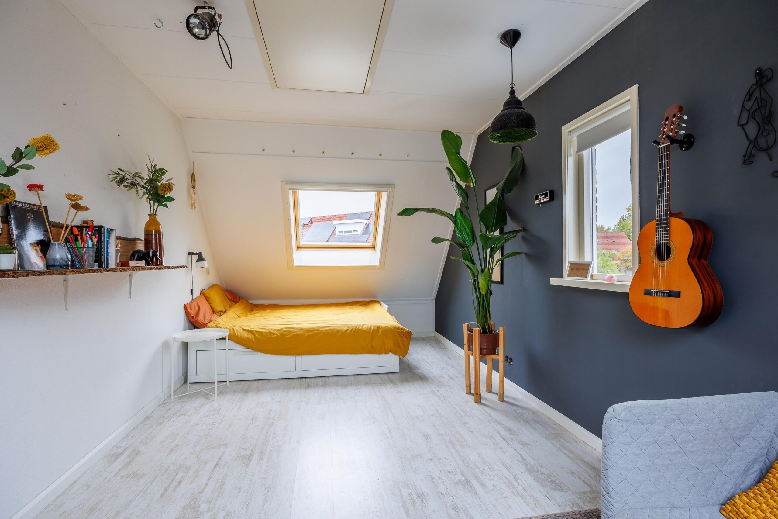 Met de vaste trap bereikt je de overloop. Aanslutiend toegang tot zolderkamer van 12,5 m² met dakkapel en bergruimte onder de knieschotten (schuifkasten). Voorts aanwezig op deze verdieping zijn de opstelling cv-ketel, omvormer zonnepanelen en mechanische ventilatie box.