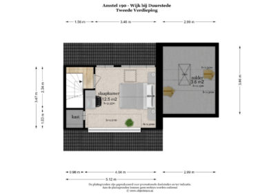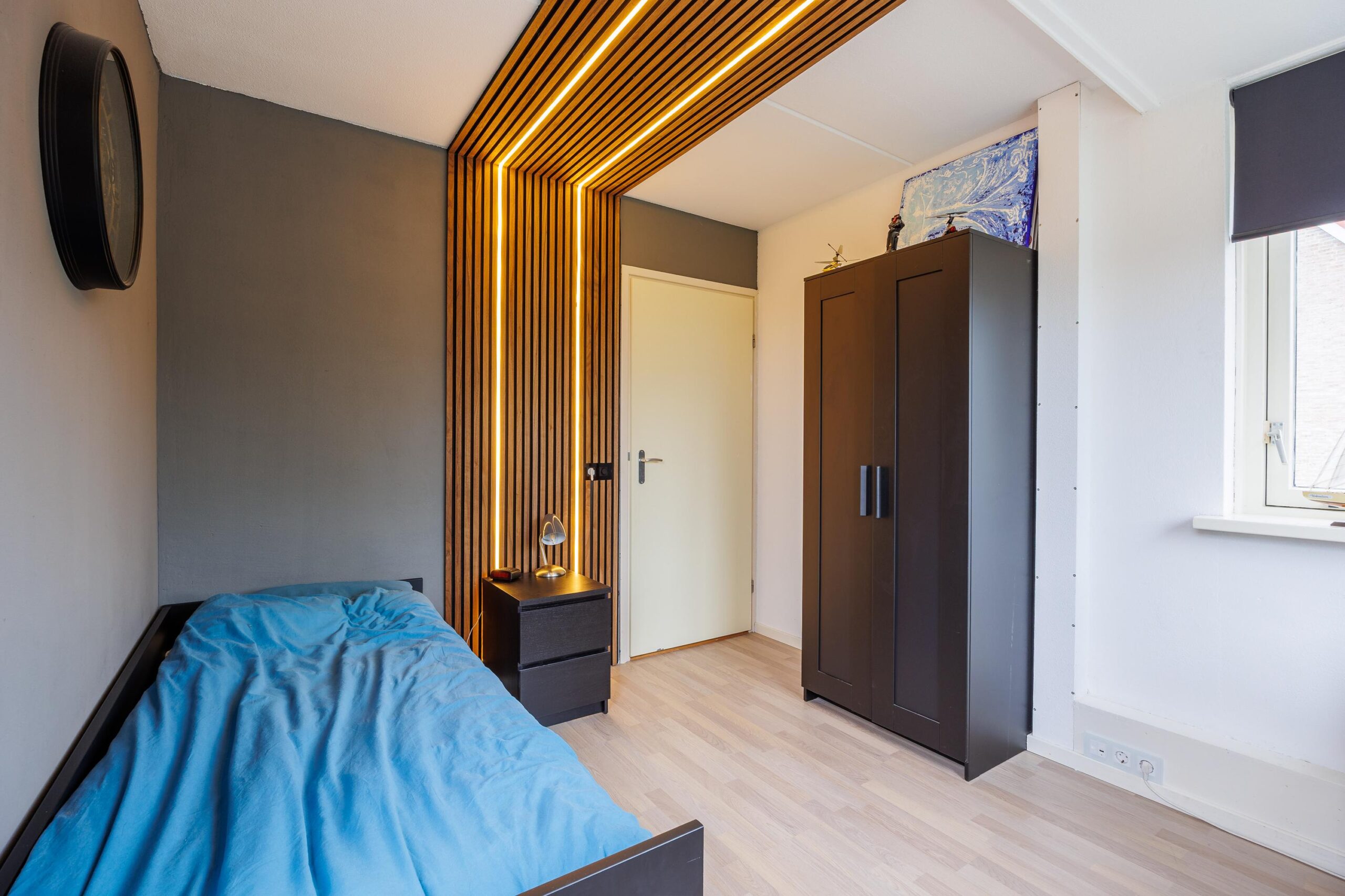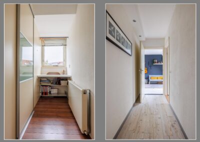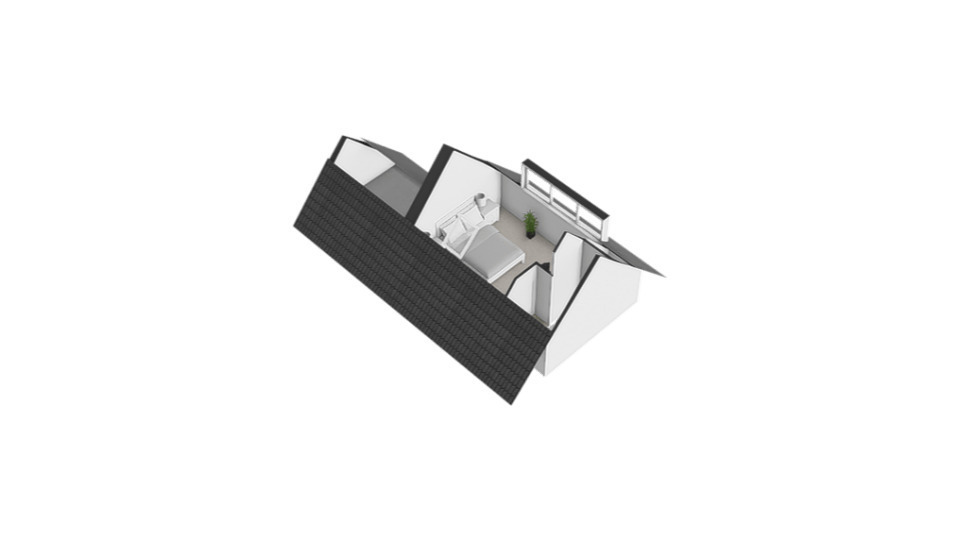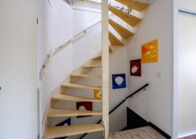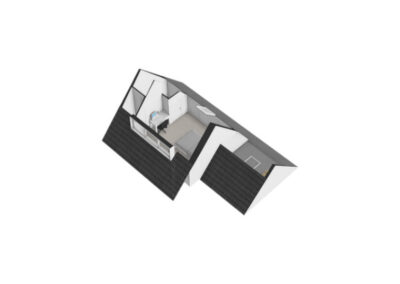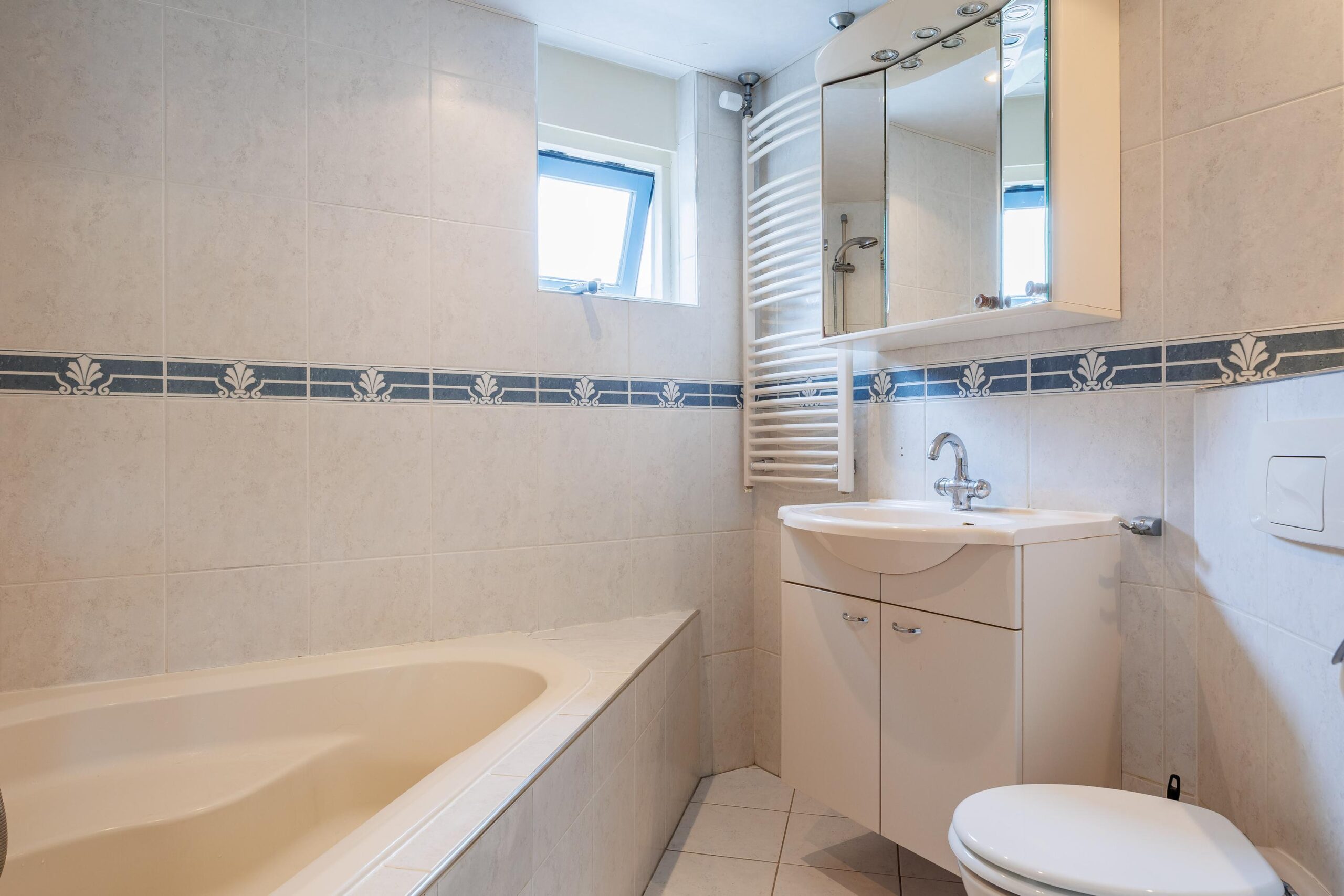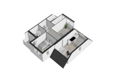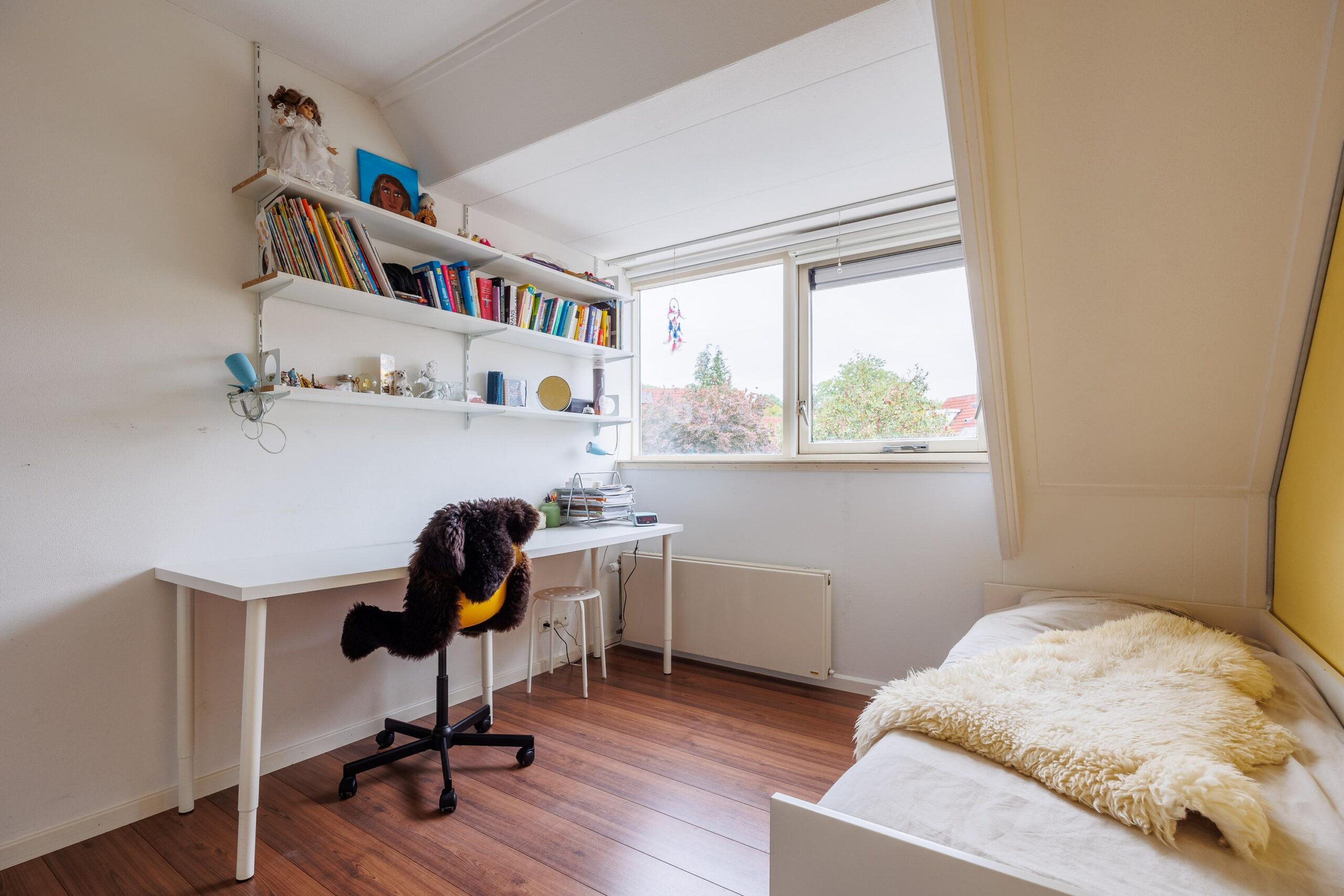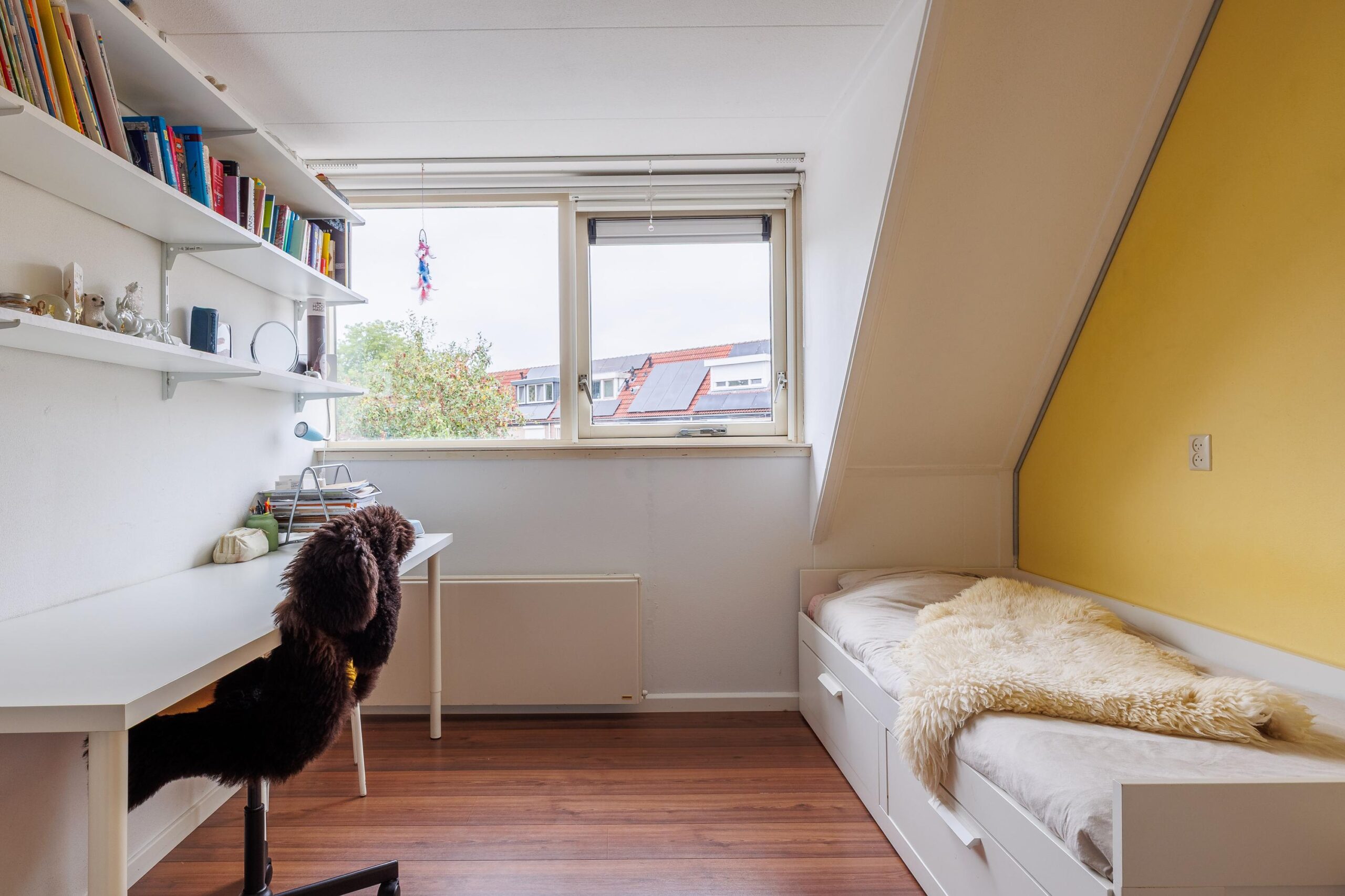 Met de vaste trap bereikt je de overloop. Aanslutiend toegang tot zolderkamer van 12,5 m² met dakkapel en bergruimte onder de knieschotten (schuifkasten). Voorts aanwezig op deze verdieping zijn de opstelling cv-ketel, omvormer zonnepanelen en mechanische ventilatie box.