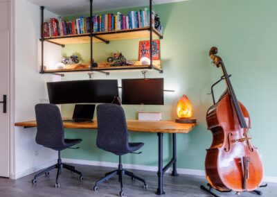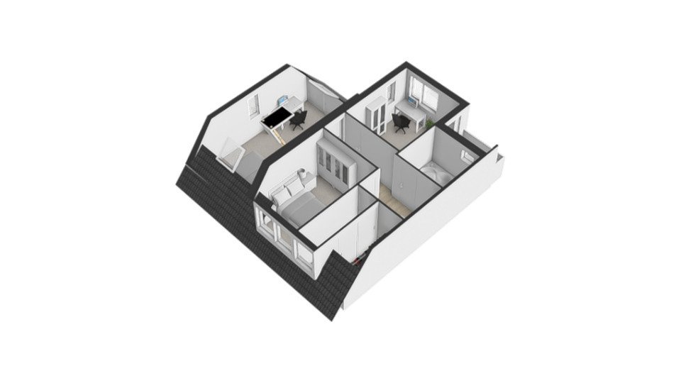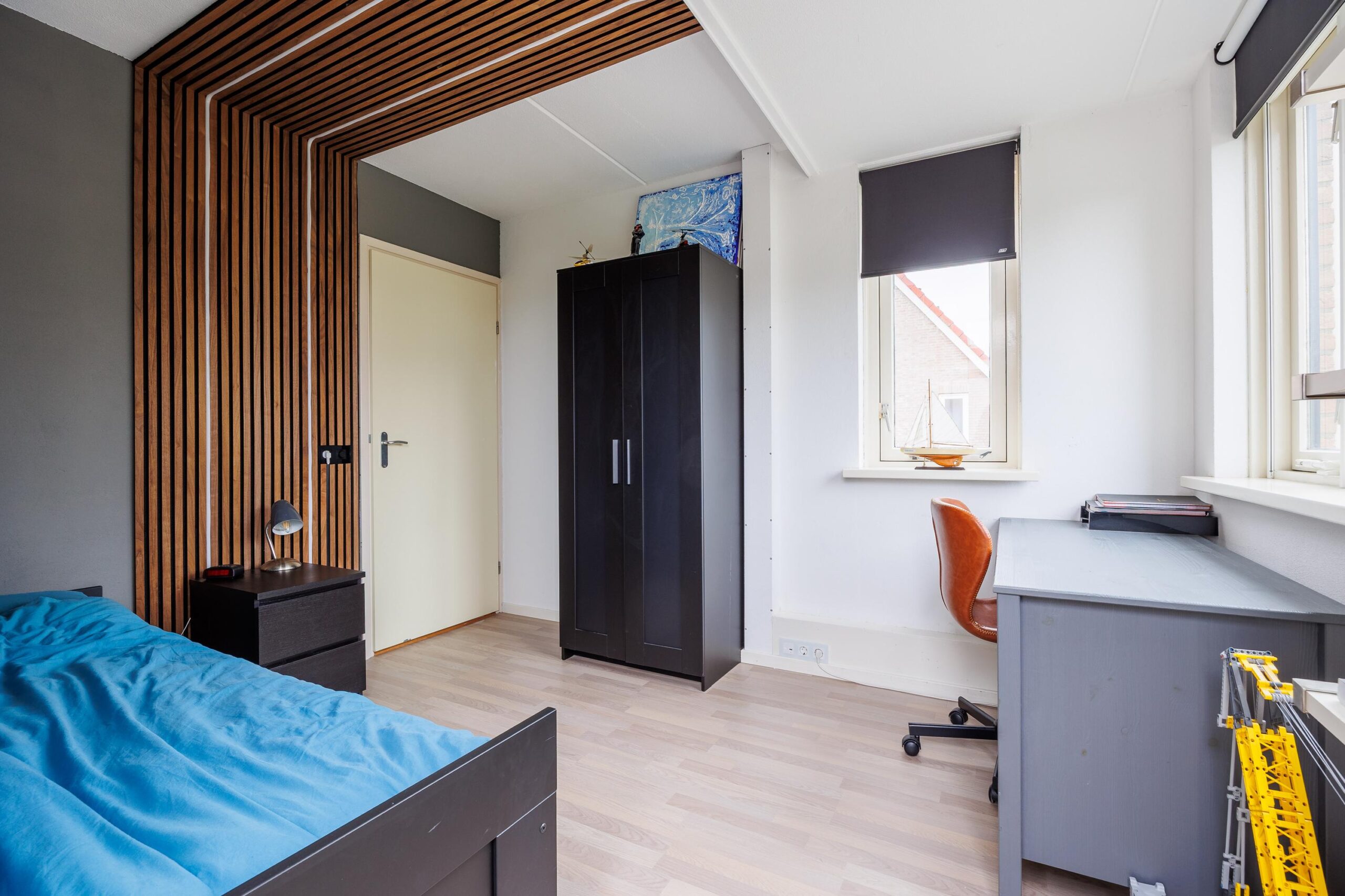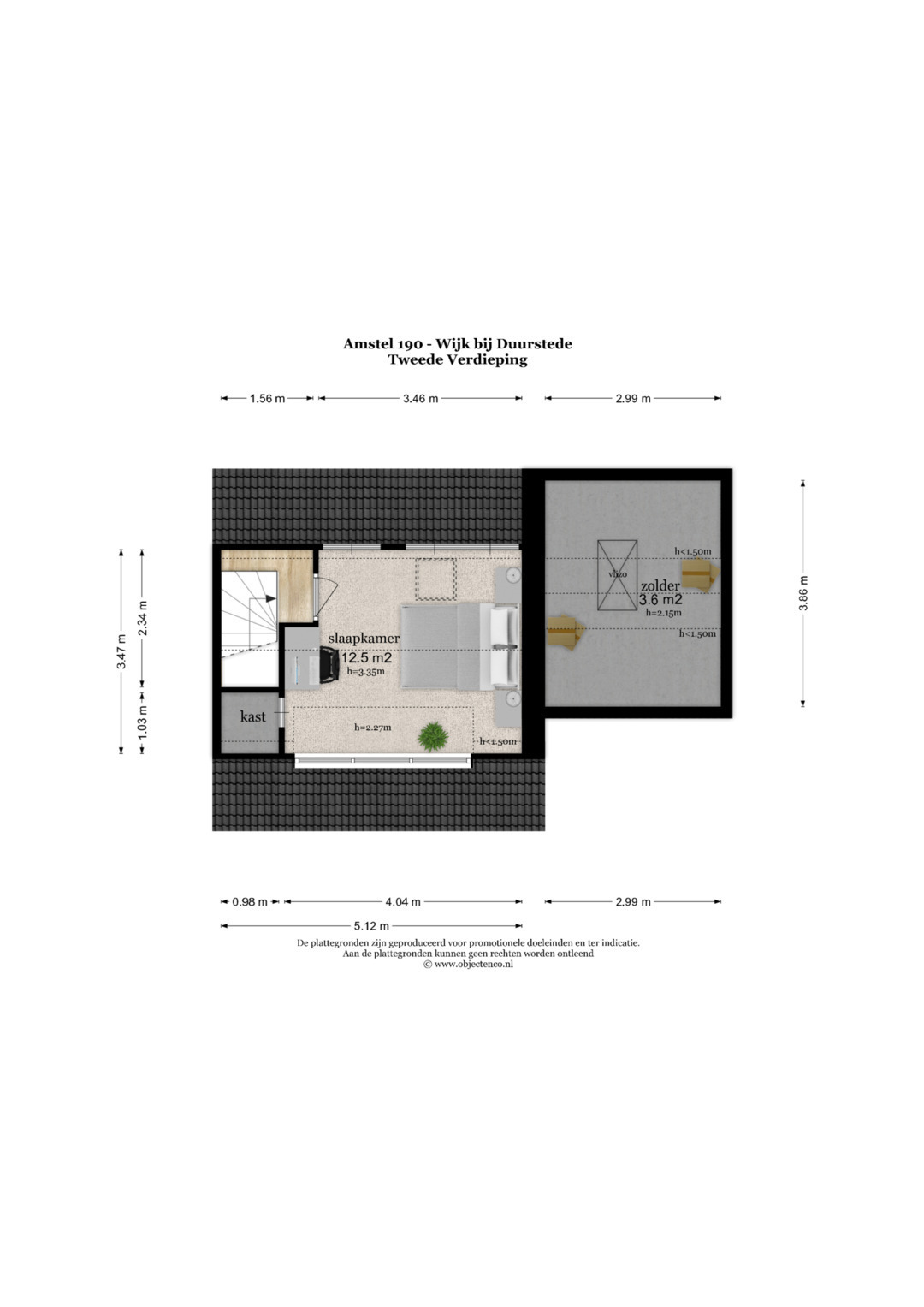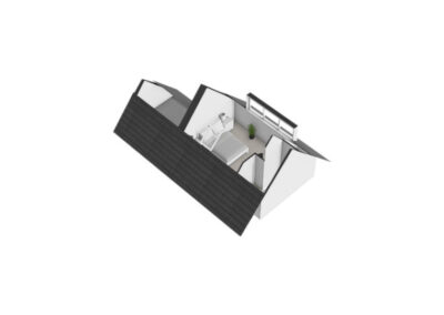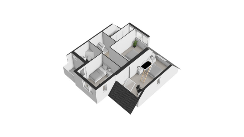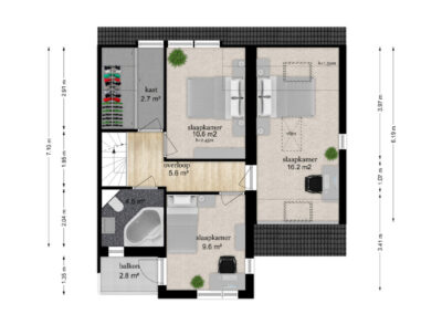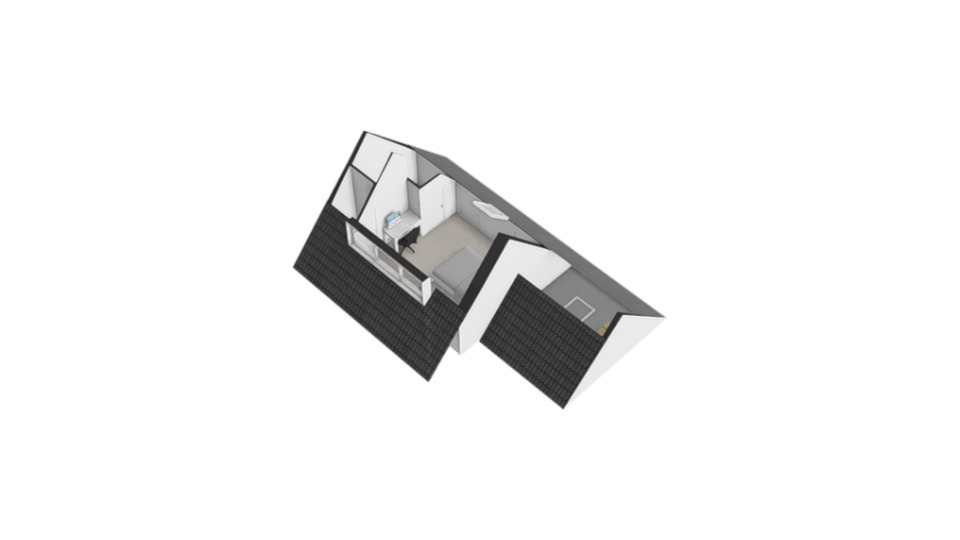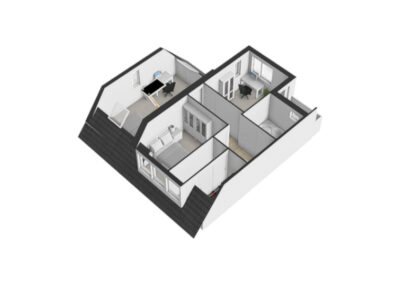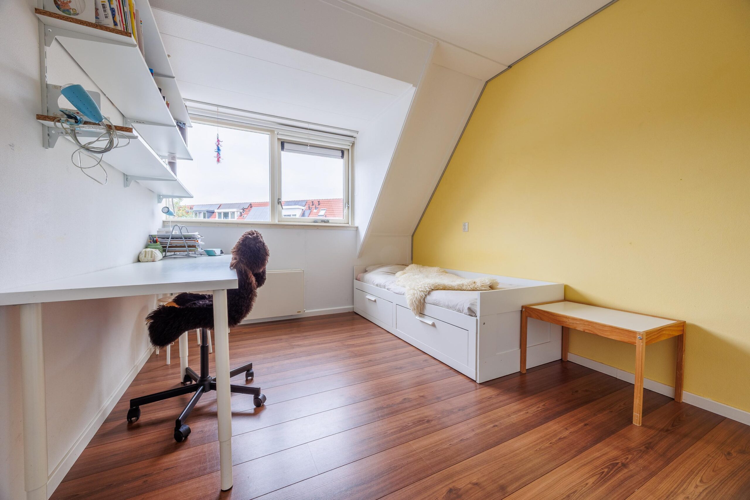 Met de vaste trap bereikt je de overloop. Aanslutiend toegang tot zolderkamer van 12,5 m² met dakkapel en bergruimte onder de knieschotten (schuifkasten). Voorts aanwezig op deze verdieping zijn de opstelling cv-ketel, omvormer zonnepanelen en mechanische ventilatie box.