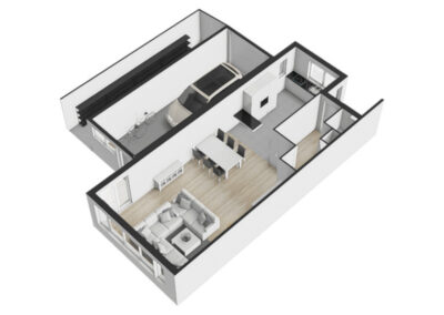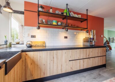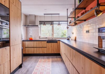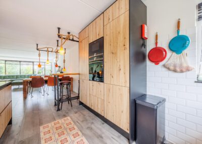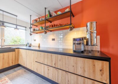 Begane grond: Oprit met plek voor 2 auto’s, nette voortuin en een schuurdeur/poort naar de achtertuin. Overdekte ENTREE, hal, toiletruimte, meterkast en toegang tot een lichte living met half open keuken, gezamenlijk circa 53 m² groot en voorzien van fraaie keramiekvloer met vloerverwarming. De inbouwkeuken is aan de voorzijde gesitueerd en ingericht met een zonevrije inductiekookplaat, afzuigkap, koelkast, vrieskast, hetelucht-/stoomoven, magnetron, vaatwasser en stenen blad. De gehele begane grond is voorzien van glad gestuukte wanden en plafond.