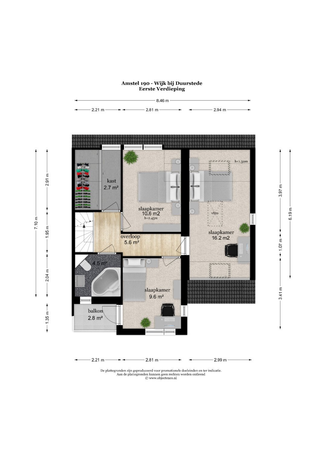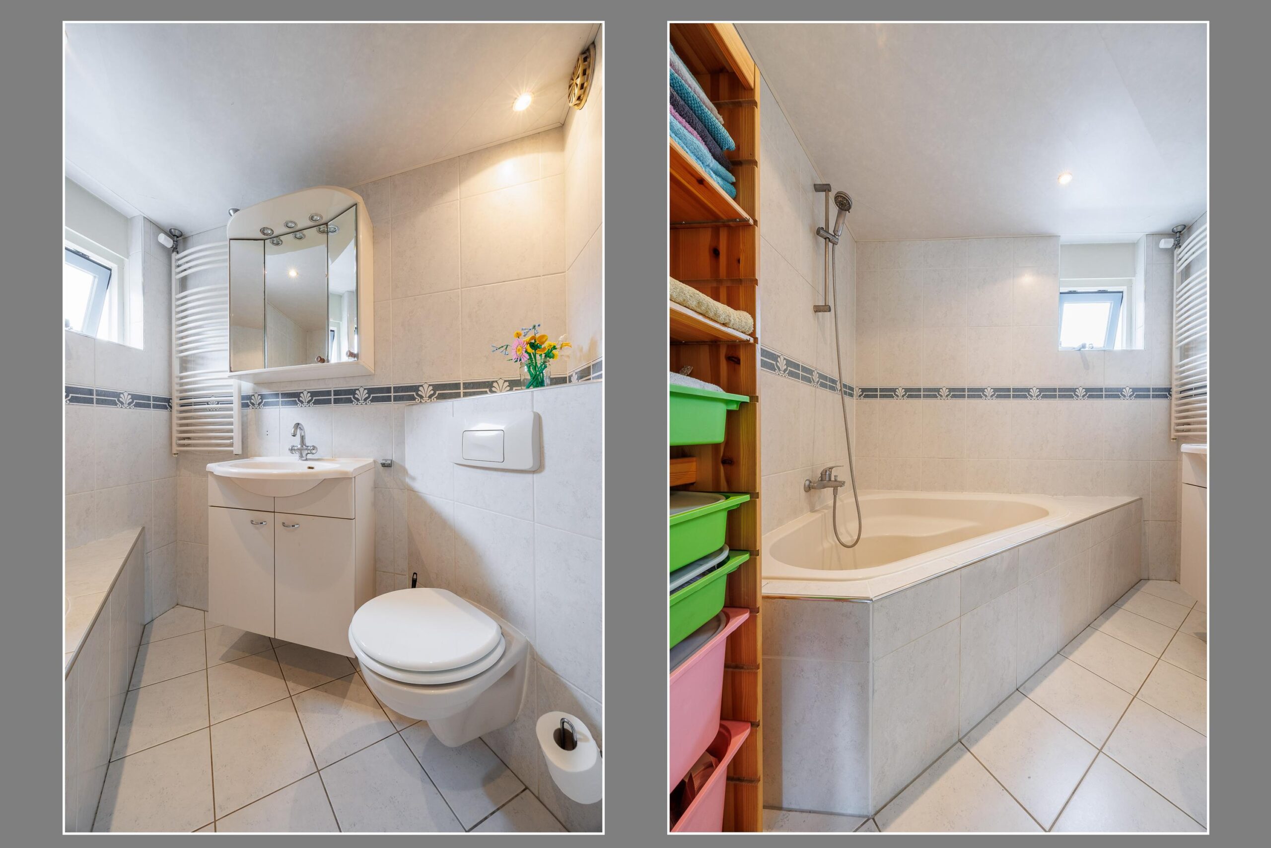 Ruime overloop met toegang naar 4 slaapkamers. De 3 grootste kamers van respectievelijk circa 16, 11 en 10 m² groot, zijn als slaapkamer in gebruik, de 4e kamer als garderobe-/inloopkast. De grootste kamer is gelegen boven de garage en biedt middels een vlizotrap nog een extra bergzolder (2.15 m. hoog). Aan de voorzijde is de badkamer gesitueerd en ingericht met hoekbad, hangend toilet, designradiator, wastafelmeubel. Aan de voorzijde is nog een klein balkon aanwezig.