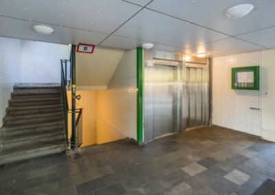 Centrale ENTREE met intercom installatie, trappenhuis, lift en toegang tot de bergingen en de gemeenschappelijke fietsenberging in de kelder.