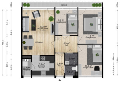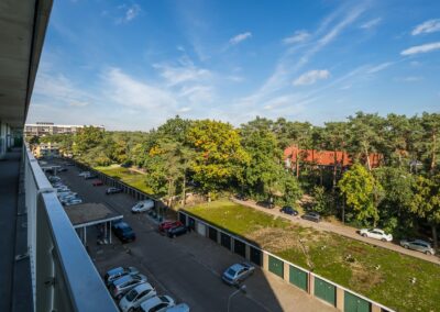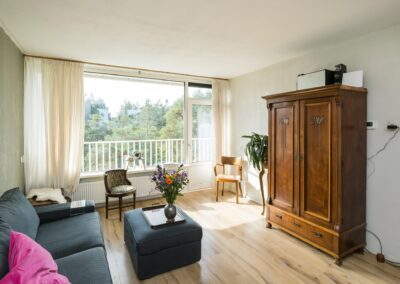 ENTREE, hal met toiletruimte, gezellige woonkamer van 20.6 m² met deur naar het balkon en een weids uitzicht over de bosrijke omgeving en gericht op het zuidwesten, open keuken uitgerust met een 4-pits kookplaat, vaatwasser en heteluchtoven. Vanuit de hal toegang tot de 3 slaapkamers van 11.4 m², 10.3 m² en 7.9 m² waarvan er 2 ook een deur naar het balkon hebben, badkamer voorzien van een inloopdouche en een vaste wastafel.
