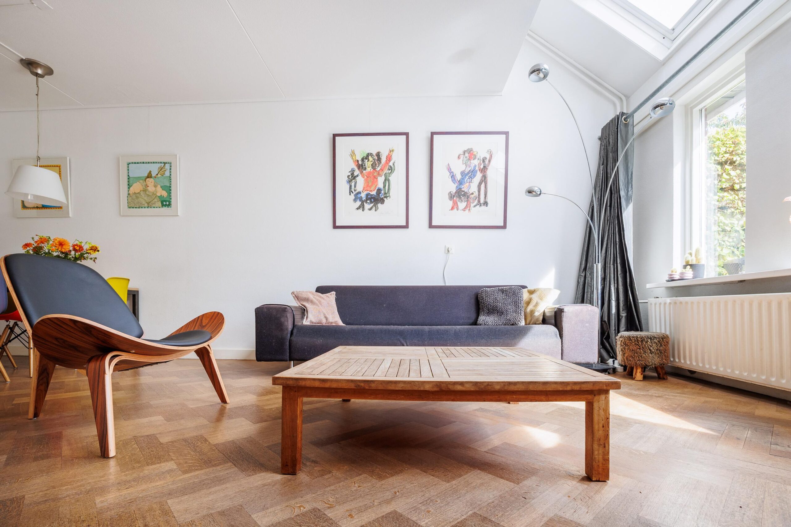 Begane grond: ENTREE, hal met toilet en fonteintje, meterkast en trapopgang naar de verdieping. De stijlvolle en uitgebouwde woonkamer is tuingericht en voorzien van 2 dakvensters voor nog meer daglicht. Vanuit de woonkamer een tuindeur naar de zonnige achtertuin. De open keuken aan de voorzijde is voorzien van een 5-pits gaskookplaat, afzuigkap, koelkast, combi oven/-magnetron en vaatwasser. De woonkamer en keuken zijn samen circa 38 m² en deels voorzien van visgraat eiken parketvloer en deels (in de keuken) een donkere tegelvloer. Aan de voorzijde van het huis is een schuur/garage van 15 m² die zowel van binnenuit als van buitenaf bereikbaar is. Hierdoor is een kantoor of praktijkruimte aan huis eenvoudig te realiseren. Nu wordt deze ruimte gebruikt als schuur met witgoedaansluitingen en er is een vliering aanwezig.