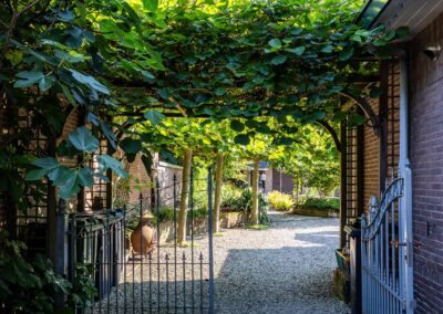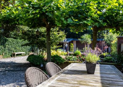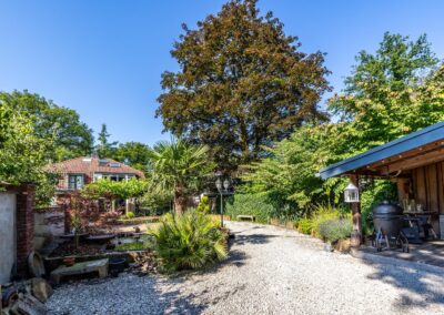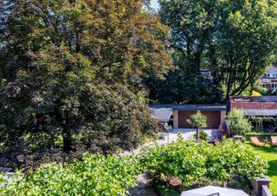 Het bijzonder fraaie bijgebouw met aaneengesloten dubbele garage, overkapping en een berging bied tevens extra mogelijkheden voor hobbyruimte en een thuiskantoor. Tevens is dit de perfecte plek voor buitenactiviteiten, zoals een gezellige barbecue met vrienden of een rustige leesmiddag in de schaduw. Deze tropische tuin voelt aan als een vakantieoord, waar u iedere dag van kunt genieten, de gehele omgeving voelt groen aan.