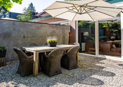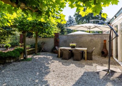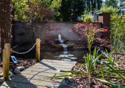 De schitterende royale tuin is een ware oase van zomerse sferen. De palmboom gecombineerd met de vijver met loopbrug is de eyecatcher van de tropische tuin. De waterfontein zorgt voor een rustgevend geluid van kabbelend water, wat bijdraagt aan de serene en ontspannende sfeer van de tuin. In deze tuin kunt u genieten van de buitenlucht, omringd door exotische planten. Tevens heeft de woning een eigen bron, waar het toilet beneden, buitenwater en wasmachine op aangesloten zitten.