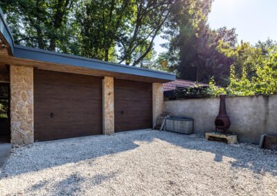 In de achtertuin bijgebouw met dubbele garage en veranda, toegang naar groenstrook achter