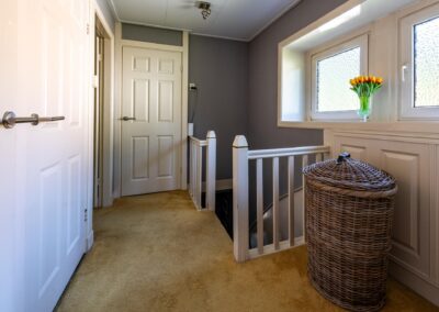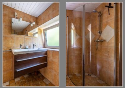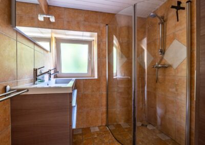 Overloop met toegang tot 3 slaapkamers, diverse bergruimtes en een badkamer uitgerust met een wastafel, douche en toilet.