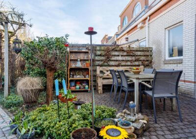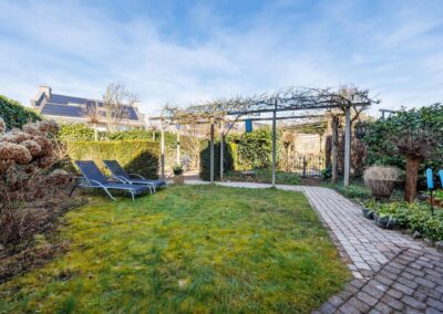 De zonnige achtertuin is fraai aangelegd met schuine zichtlijnen. Voorzien van diverse soorten groen en meerdere zithoekjes, waarbij aan het huis een heerlijk overdekt terras is gecreëerd. De voortuin bevat naast een ruime oprit voor meerdere auto’s ook nog een mooie tuin en plek voor een zitje in de ochtendzon