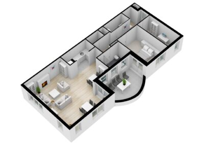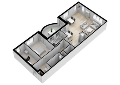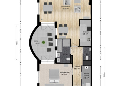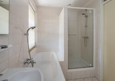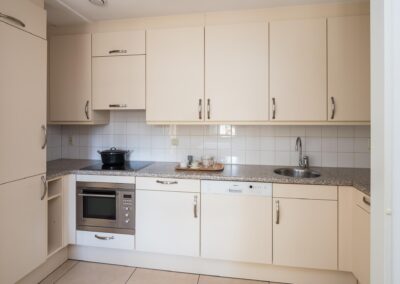 Toegang tot het appartement middels een ruime hal voorzien van de meterkast, garderobe en toiletruimte. De ruime woonkamer van 46,6 m² heeft veel lichtinval en middels openslaande tuindeuren heeft u toegang tot het balkon met een mooi uitzicht op de tuin. De halfopen keuken is vanuit de woonkamer bereikbaar en is voorzien van diverse inbouwapparatuur waaronder een inductie kookplaat, koelkast, oven en vaatwasser. Vanuit de hal zijn de 2 slaapkamers van 14,8 m² en 9,6 m² toegankelijk, waarvan de hoofdslaap[kamer eveneens tuindeuren naar het balkon heeft. De badkamer is uitgerust met een ligbad, een separate douche, dubbele wastafel en een zwevend toilet. Verder is er een separate berging waar de cv-ketel en de aansluiting voor wasmachine en wasdroger is gesitueerd.