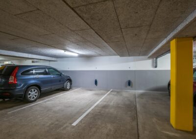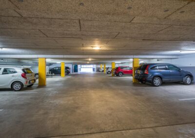 In de onderbouw van het gebouw bevindt zich de afgesloten parkeerkelder, waar voor elk appartement een eigen parkeerplaats is en een eigen ruime berging.