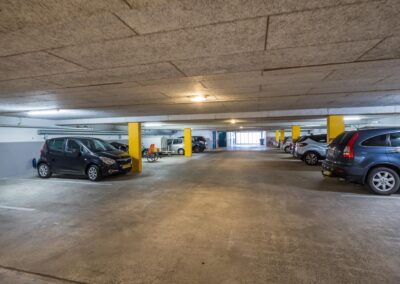 In de onderbouw van het gebouw bevindt zich de afgesloten parkeerkelder waar voor elk appartement een eigen parkeerplaats is en een eigen ruime berging.