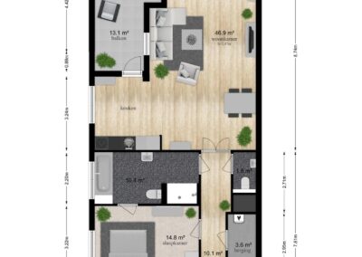 Toegang tot het appartement middels een ruime hal met garderobe en toiletruimte. De ruime en lichte woonkamer met aansluitend de open keuken in hoekopstelling en voorzien van inbouwapparatuur waaronder een inductiekookplaat, koelkast, combimagnetron en vaatwasser. De woonkamer en keuken zijn samen 46,9 m² groot en zowel vanuit de woonkamer als vanuit de keuken is er toegang tot het heerlijke zonneterras/ balkon van 13 m² met veel privacy en voorzien van een windscherm en een zonnescherm.