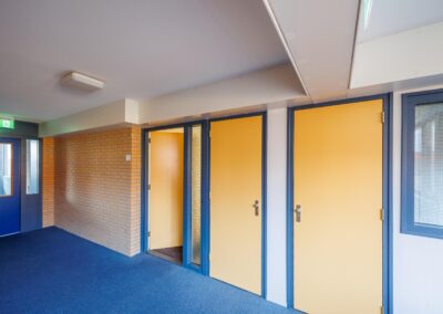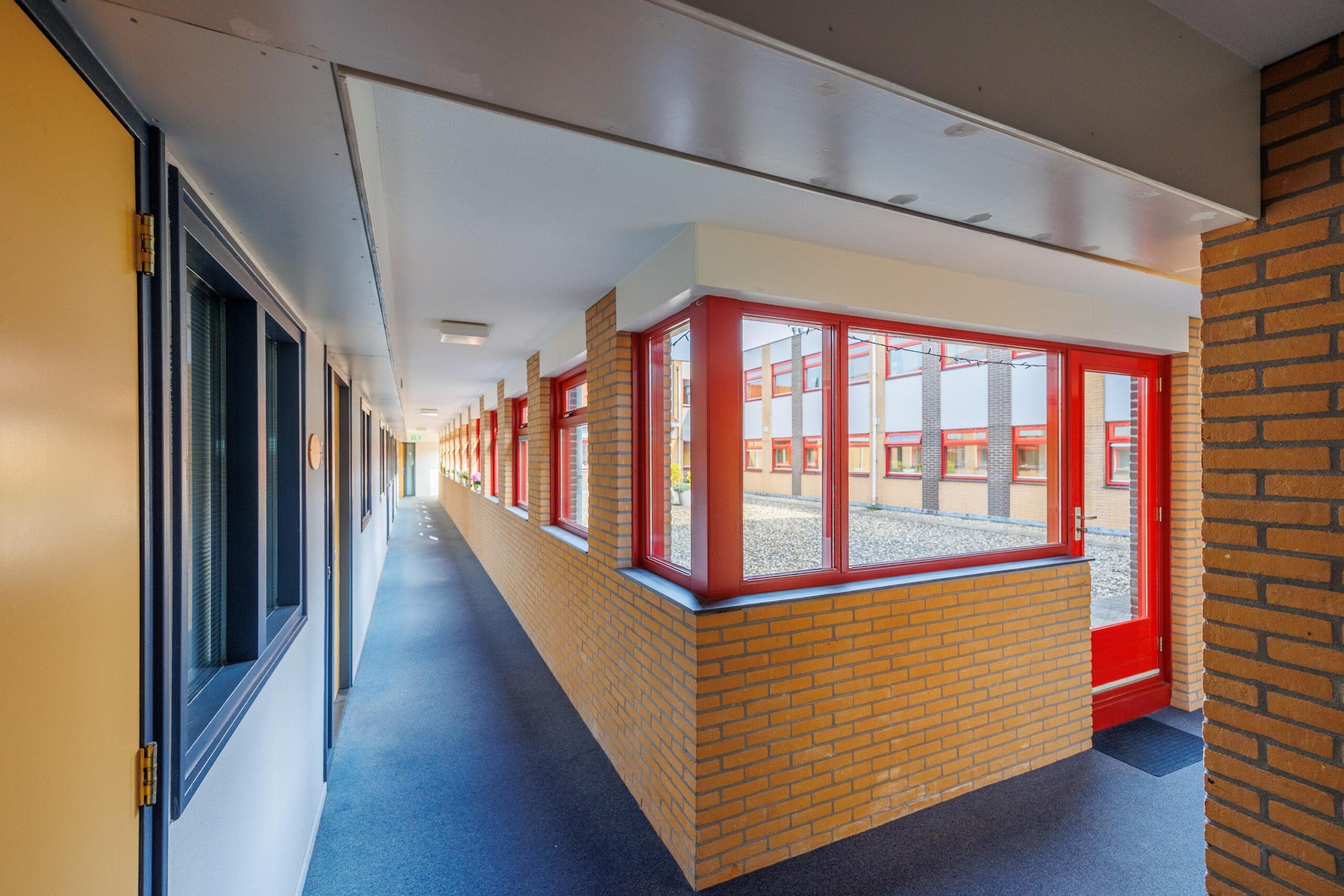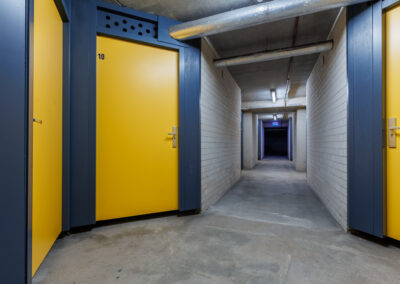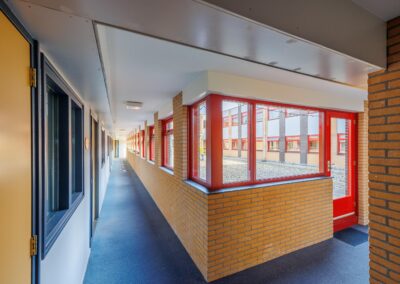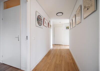 Gelegen op de eerste woonlaag, centrale hal met toegangsdeuren van de appartementen en zicht op het binnenterrein.