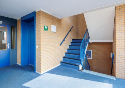 Afgesloten portiek met brievenbussen, trappenhuis en lift van het appartementencomplex.