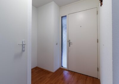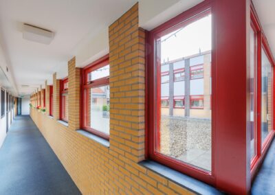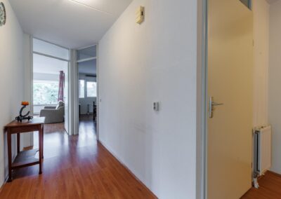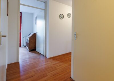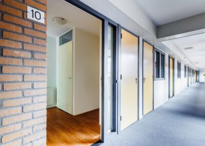 Gelegen op de eerste woonlaag, centrale hal met toegangsdeuren van de appartementen en zicht op het binnenterrein.