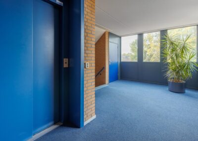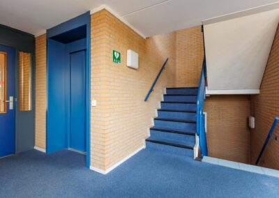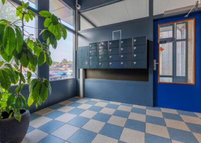 Afgesloten portiek met brievenbussen, trappenhuis en lift van het appartementencomplex.