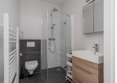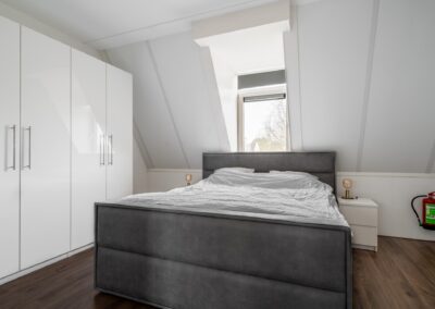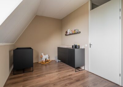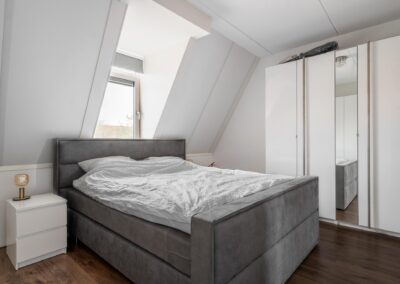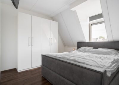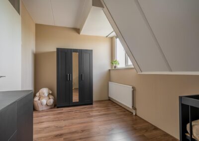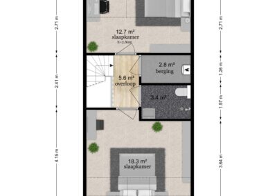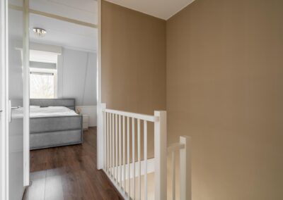 Via een open trap tussen de woonkamer en de keuken is de verdieping bereikbaar. Deze verdieping heeft 2 slaapkamers van 18,3 m² en 12,7 m² en een moderne badkamer uitgerust met inloopdouche (hand- en regendouche), 2e toilet en wastafelmeubel. Tevens een praktische inpandige bergruimte met de CV-opstelling en aansluitingen voor een wasmachine en droger. Deze gehele verdieping is afgewerkt met een mooie laminaatvloer.