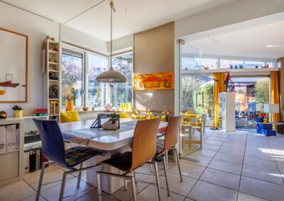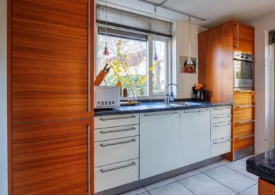 Bij binnenkomst wordt u ontvangen in de hal met meterkast, garderoberuimte, trapkast en een nette toiletruimte met fonteintje. Vanuit hier loopt u door naar de verrassend ingedeelde woonkeuken, waar een moderne Bulthaup wandopstelling centraal staat. Deze is uitgerust met hoogwaardige inbouwapparatuur, waaronder een 5-pits gasfornuis, vaatwasser, oven, luxe schouw en fraaie granieten werkbladen. Aansluitend bevindt zich de lichte eetkamer, met een mooi vrij uitzicht over de tuin en directe toegang naar buiten. Dankzij een fraaie kastenwand is er een subtiele scheiding tussen keuken en eetkamer gecreëerd. Via stijlvolle glazen openslaande deuren bereikt u de woonkamer, waar de grote glazen schuifpui zorgt voor een zee aan licht en een fijne verbinding met de tuin. De gehele begane grond is afgewerkt met een lichte plavuizen vloer voorzien van comfortabele vloerverwarming.