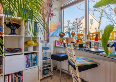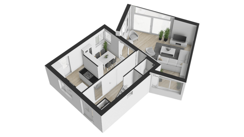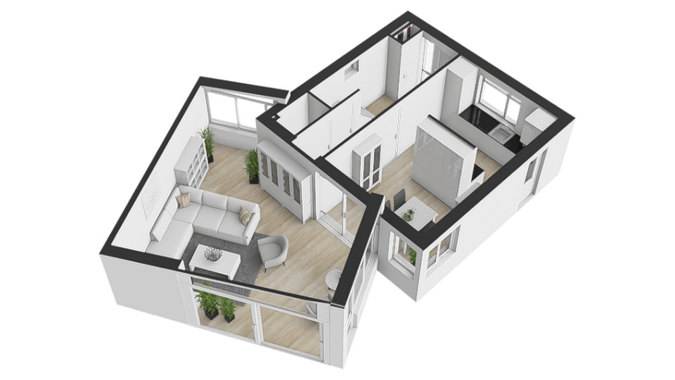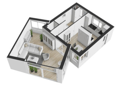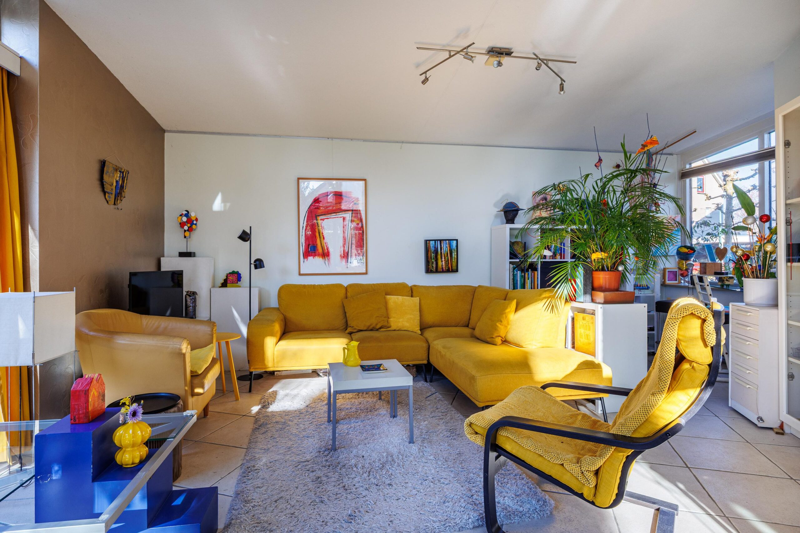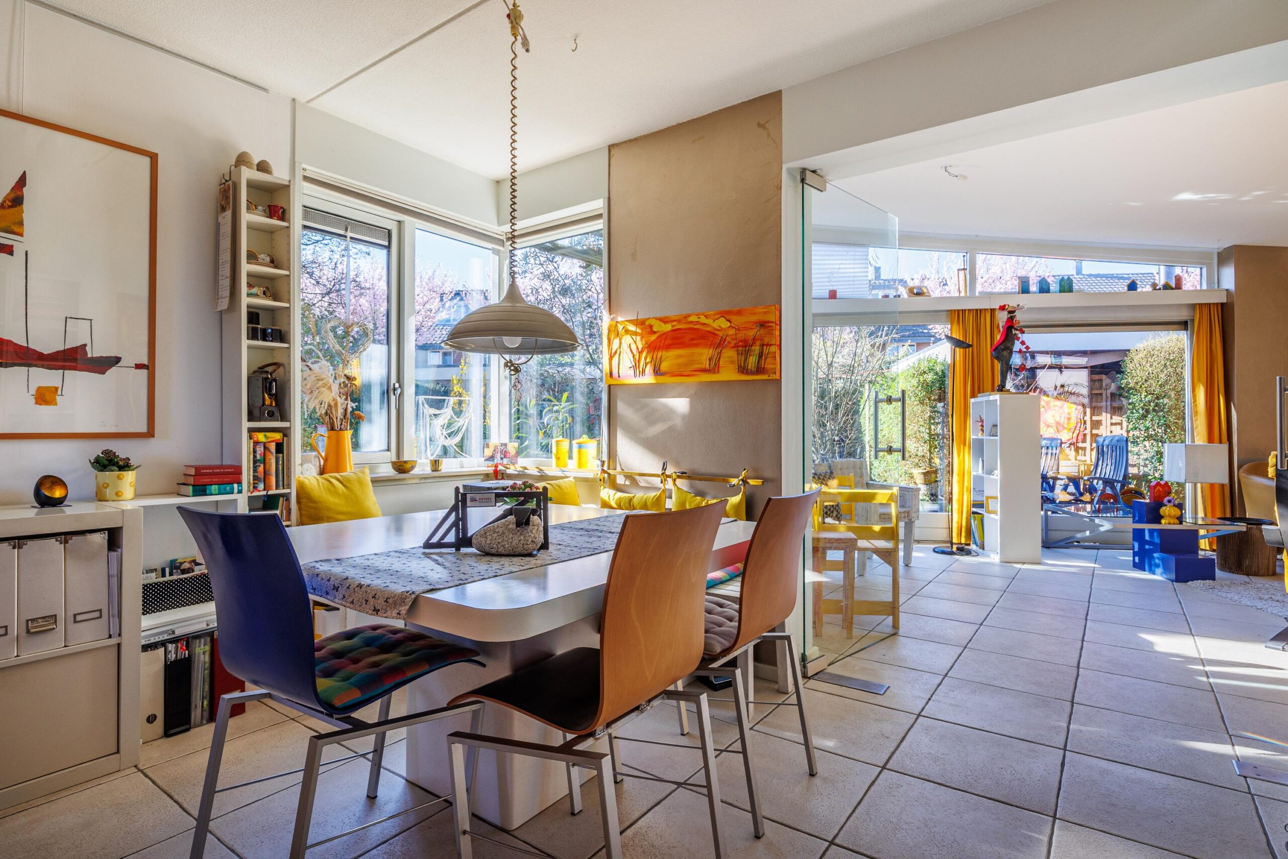 • Woonkamer met verrassende raampartijen.