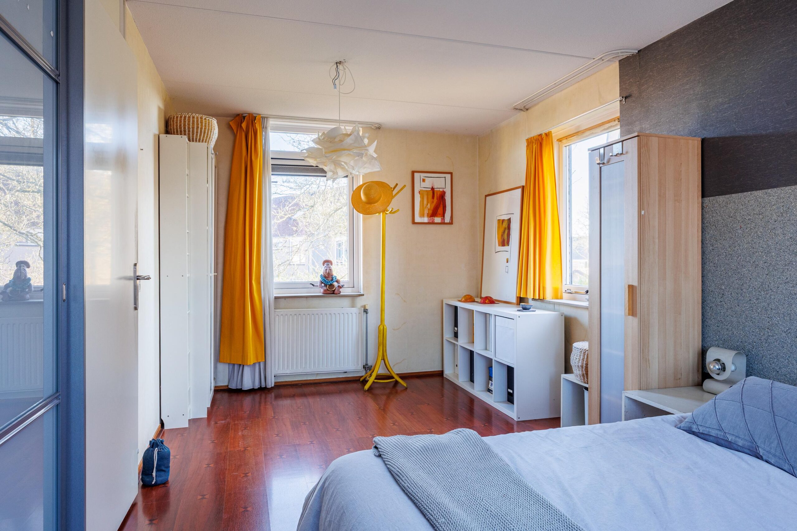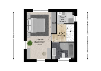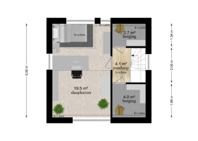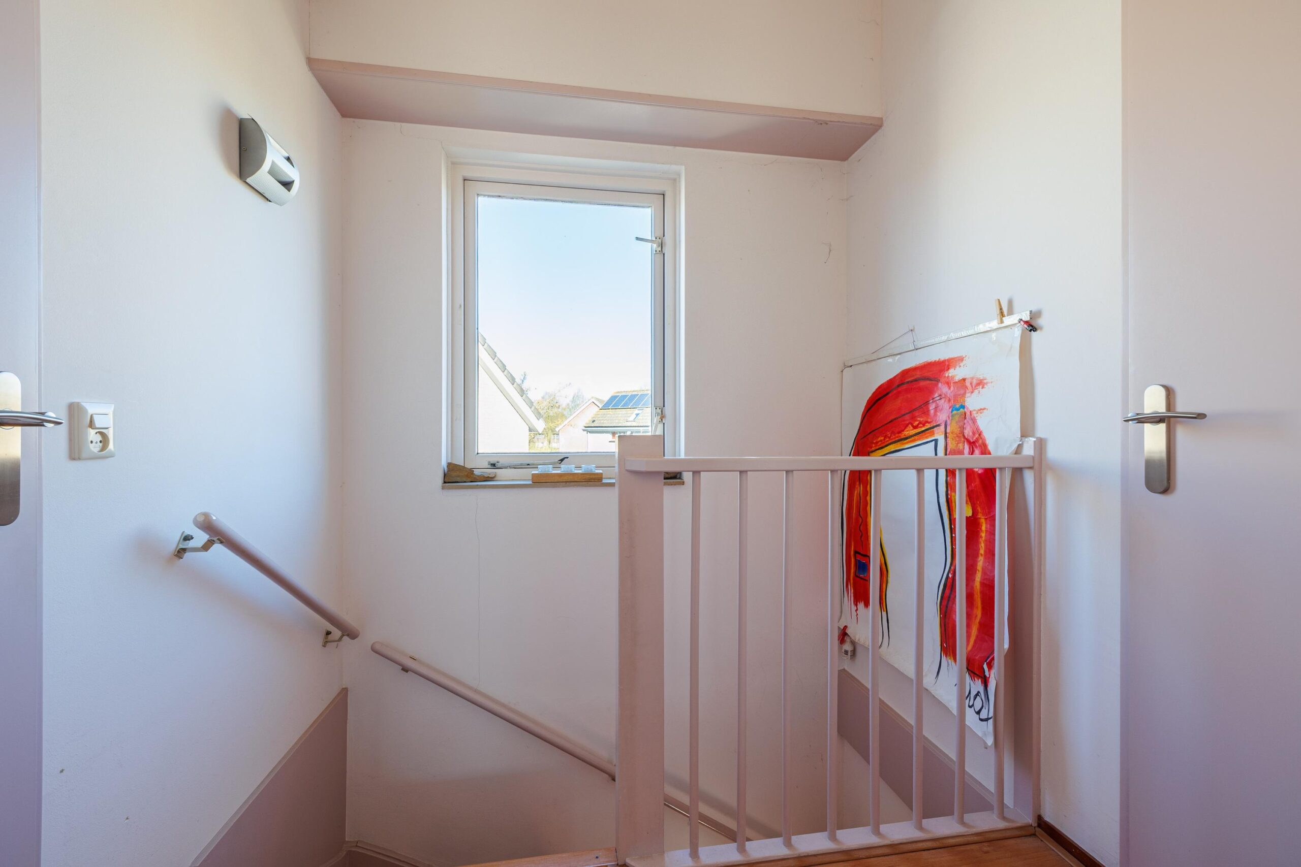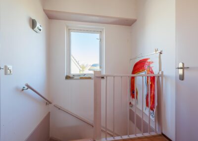 Overloop met toegang tot een slaapkamer met dakkapel (mogelijk om er 2 slaapkamers van te maken). Berging en inloopkast.