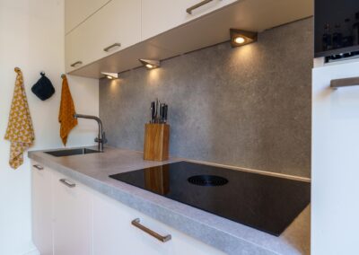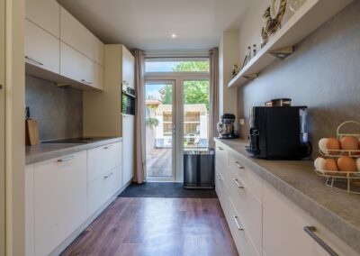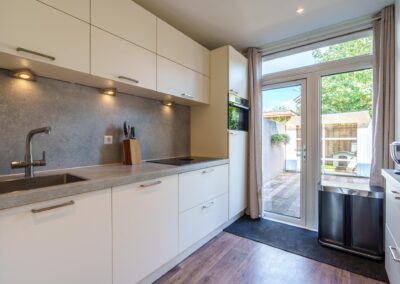 ENTREE, hal met meterkast, moderne toiletruimte, trapkast en trapopgang. De ruime en lichte doorzonkamer van 26,6 m² groot, is voorzien van laminaatvloer, glad stukwerk, fraaie inbouwspots en een brede schuifpui naar de achtertuin. De moderne en dichte keuken is voorzien van divers inbouwapparatuur, zoals een inductiekookplaat met geïntegreerde afzuiging, combi-oven, koelkast, vriezer, vaatwasser en Quooker. Vanuit de keuken is er tevens toegang tot de achtertuin.