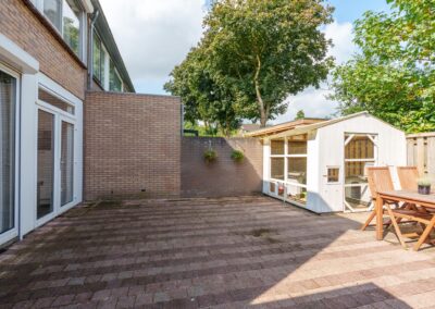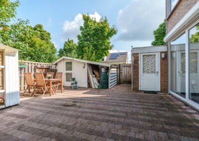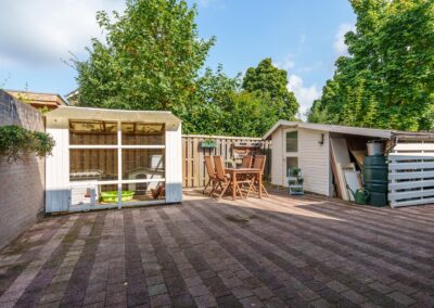De achtertuin is gelegen op het noordwesten en heeft een zonnig terras. Tevens is er een kippenhok, tuinhuis en een achterom. De ruime voortuin biedt een parkeergelegenheid voor maar liefst 3 auto’s. De garage van 17,2 m², is zowel via de voortuin als de achtertuin bereikbaar.