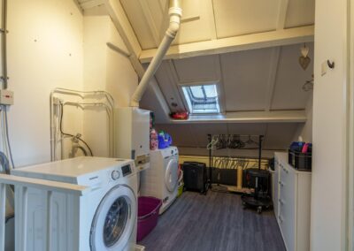 Vaste trap, overloop met cv- en wasruimte en toegang tot een vierde slaapkamer van 13,8 m².