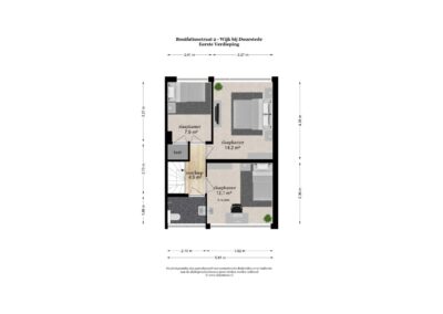 Overloop met toegang tot 3 slaapkamers van 14,2 m², 12,1 m² en 7,9 m². De betegelde badkamer is voorzien van een inloopdouche, toilet en een wastafelmeubel.