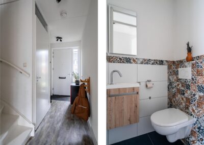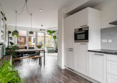 ENTREE, hal met garderobe, fraai betegeld toilet, toegang tot de gezellige woonkamer met openslaande deuren naar de achtertuin, de open en moderne keuken (2015) aan de voorzijde van de woning is voorzien van een 4-pits gasfornuis, afzuigkap, combi-oven, koel-/ vriescombinatie en vaatwasser, onder de trap bevindt zich een praktische provisiekast. Woonkamer en keuken zijn samen circa 36 m² groot.