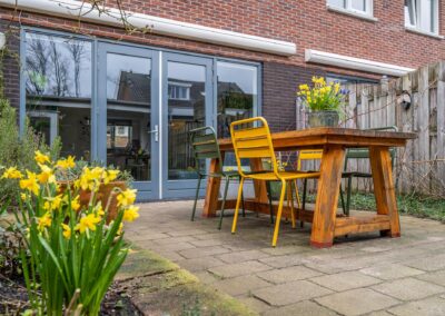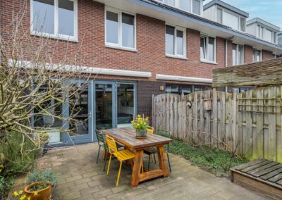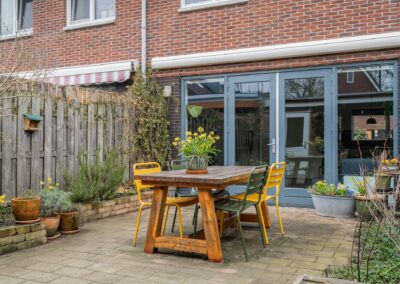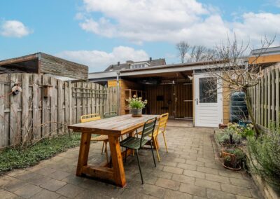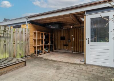 De achtertuin heeft een gunstige zonligging op het zuidwesten en is ingericht met terras, beplanting en een overkapping van 10 m². Deze overkapping is als veranda te gebruiken, maar kan ook terug worden gebracht naar de oorspronkelijke carport. Achterin de tuin treft u de berging voorzien van elektra.