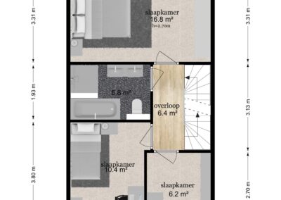Overloop, hoofdslaapkamer van 16,8 m² aan de achterzijde van de woning en 2 slaapkamers van 10,4 m² en 6,2 m² aan de voorzijde, de met Portugese gedeeltelijk betegelde luxe moderne badkamer is voorzien een toilet, ligbad, inloopdouche, vaste wastafel en vloerverwarming.