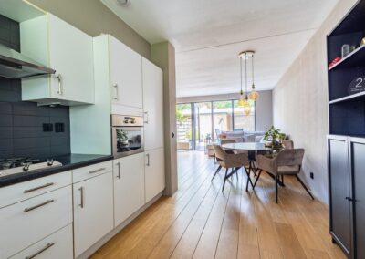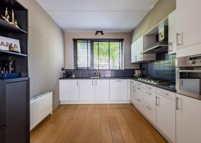 De woning is gelegen aan een plantsoen, wat zorgt voor een groen uitzicht aan de voorzijde. Tevens is het ideaal dat de kinderen hier kunnen spelen, terwijl u een oogje in het zeil kunt houden. Binnen treft u een sfeervolle woonkamer met een open hoekkeuken, uitgerust met diverse inbouwapparatuur. De keuken biedt niet alleen veel werk- en opbergruimte, maar ook zicht op het plantsoen, wat koken een nog aangenamere ervaring maakt.