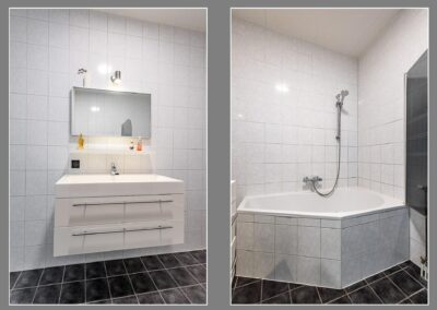 Overloop met toegang tot de 3 slaapkamers van 16,9 m², 10,5 m² en 6,4 m² en de inpandige badkamer uitgerust met een toilet, ligbad en vaste wastafel.